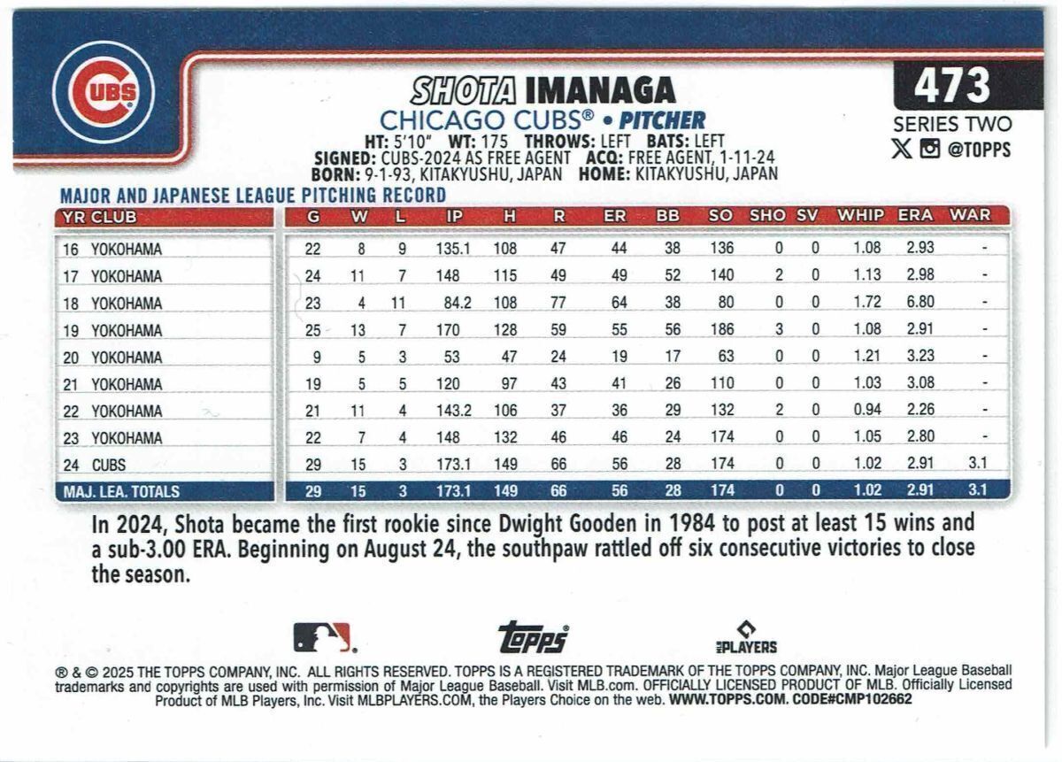 今永昇太 2025 Topps Series 2 #473 - Cubs シカゴ カブス