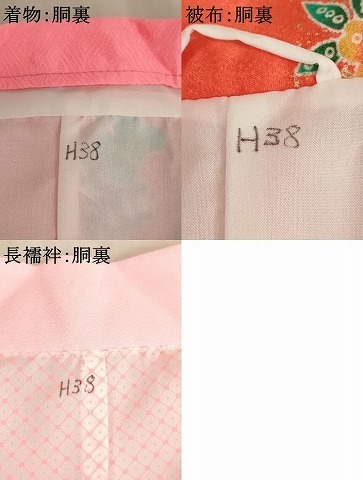 【祝着】 身丈 73.5cm(肩から) 裄丈 43cm(肩上げ 2cm) 袖丈 55.5cm 縫込み 3cm 袖幅 27cm 前幅 14.5cm 後幅 20cm 着物縫いこみ 内揚げ 0cm (腰上げ 8cm) 裄 お袖側 約0cm 身頃側 約0cm 【被布】 身丈 49.5cm(肩から) 裄丈 12.5cm(肩上げ 2.5cm) 前幅 13.5cm 後幅 18cm 【長襦袢】 身丈 60cm(肩から) 裄丈 43cm(肩上げ 1.5cm) 袖丈 54.5cm 縫込み 5cm 袖幅 25cm 前幅 23cm 後幅 19.5cm 着物縫いこみ 内揚げ 0cm (腰上げ 6cm) 裄 お袖側 約3.5cm 身頃側 約0.5cm 《 サイズについてはこちら 》 |