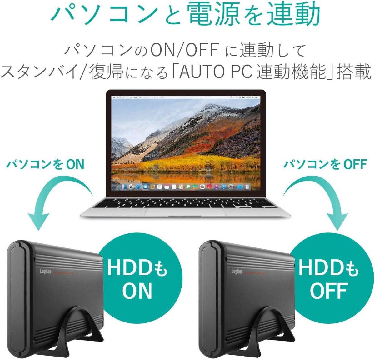 「AUTO PC連動機能」を搭載していますので、パソコンの電源ON/OFFに連動しハードディスクがスタンバイ/復帰します。ACアダプタの抜き忘れによる無駄な消費電力の低減が可能です。