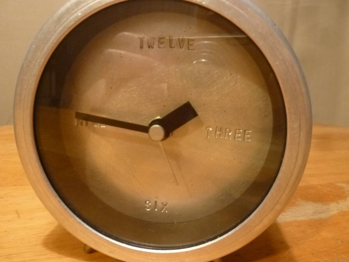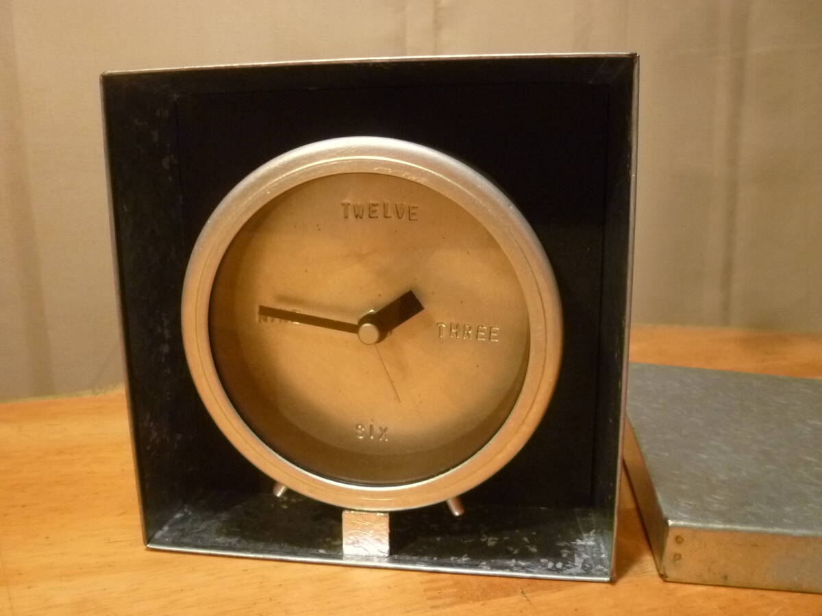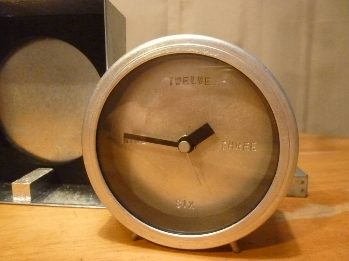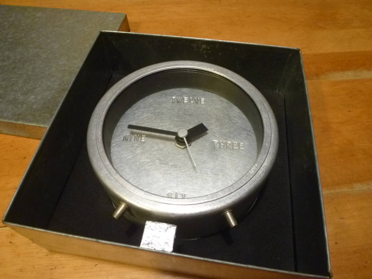 こちらは金属製の円形枠に収められた時計で、同製文字盤には4箇所英字の掘り込みで単純な時間表示となっていて、黒の長短針が引き立ち、秒針付となっています。時計機構は硬めのスポンジ?にはめ込まれそのまま外形枠に同様に、フタ付き収納ケース内にはスポンジ?円形枠に収まる様な処理があり、はめ込み寝かせて収納となりますが、後部に使用の単三電池1本は別となります。