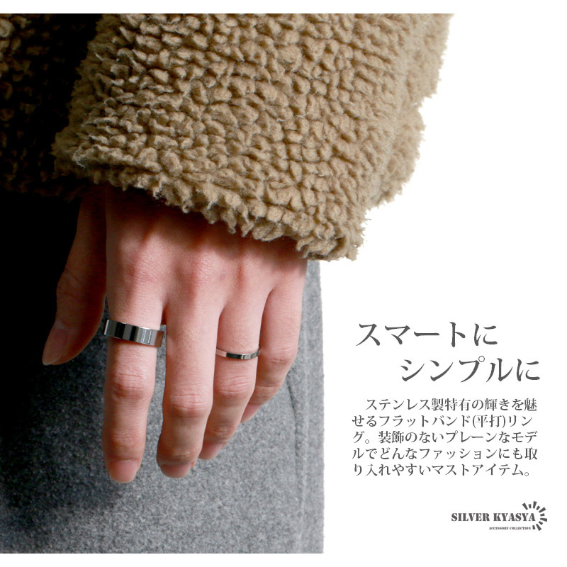 ・ステンレス製特有の輝きを魅せるフラットバンド(平打)リング。装飾のないプレーンなモデルでどんなファッションにも取り入れやすいアイテム。