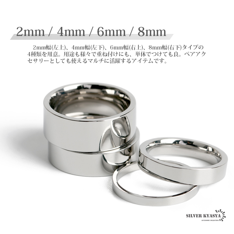 ・2mm幅、4mm幅、6mm幅、8mm幅タイプの4タイプ。様々なシーンで使え用途も様々。単体でつけても、重ね付けにも使え、ペアアクセサリーとしても使えるマルチに活躍するアイテムです。