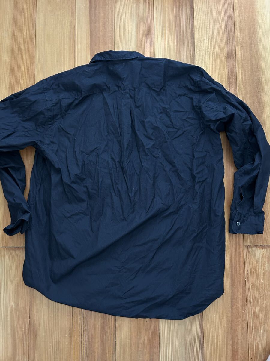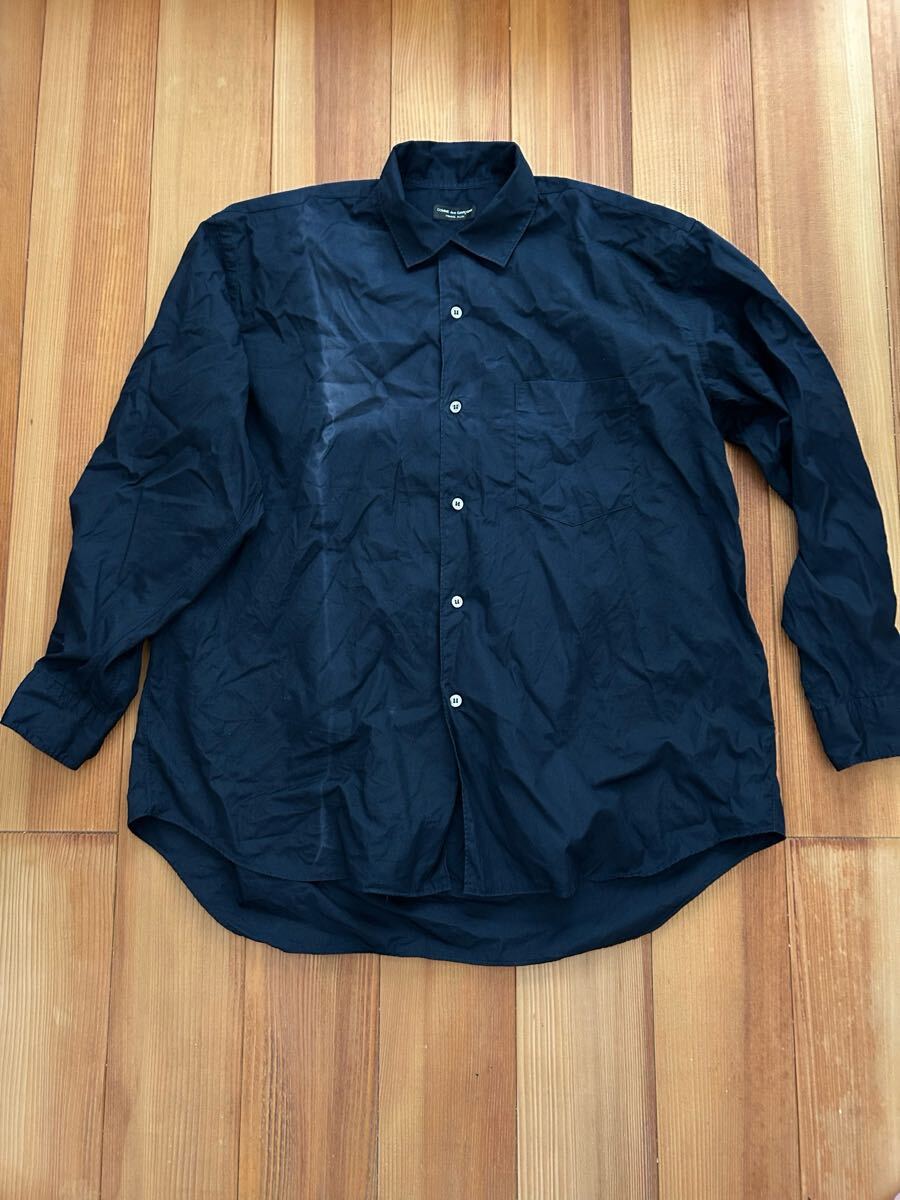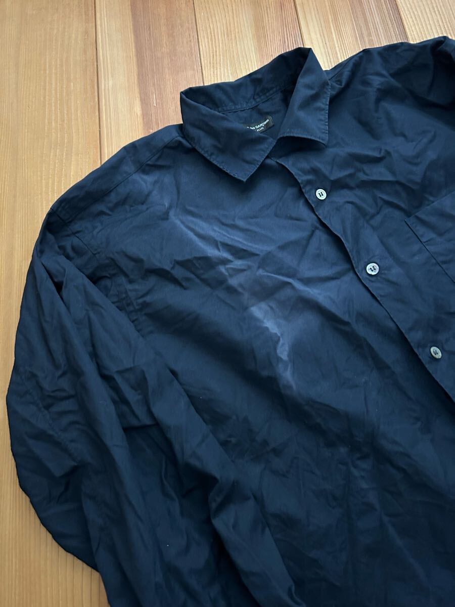 プリュスの1991の長袖シャツです。写真からわかります様に前面に変色がございます。保管中についたと思います、洗濯してもだめでした。サイズ表記はなく着丈(後ろの首の付け根)が約79.身幅62.色は黒に近い紺です。