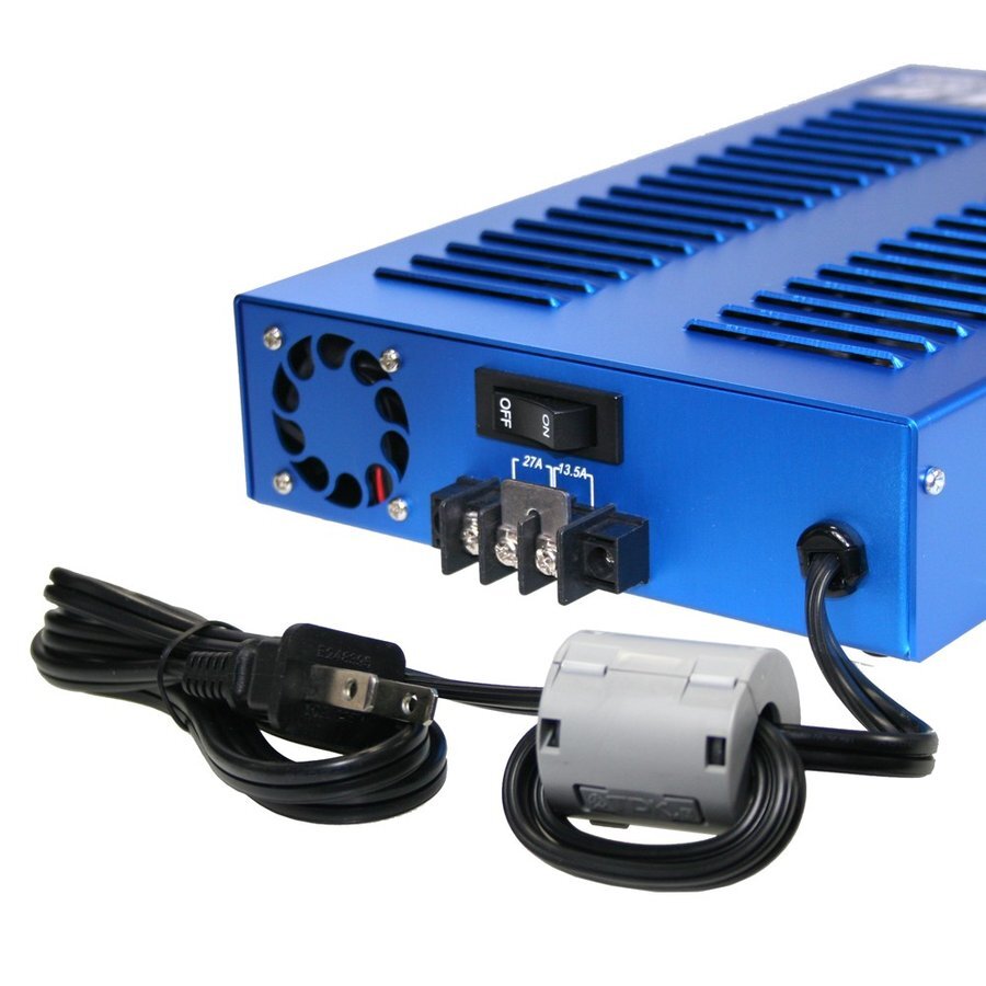 大容量独立2回路出力 AC100V電源をDC12Vに変換して出力します。全てのターミナルを使用する場合、左側のメス型バナナ端子2組に合計13.5A、右側ビック端子に13.5A出力します。内部が13.5A X 独立2回路になっているため、右側ビック端子に主充電器を使用し、左側のメス型バナナ端子2組(ターミナル1&2)には、クーリングファン、タイヤウォーマー、モーターならし器、タイヤセッター、放電器などのアクセサリーを同時使用しても主充電作業に影響を与えません!