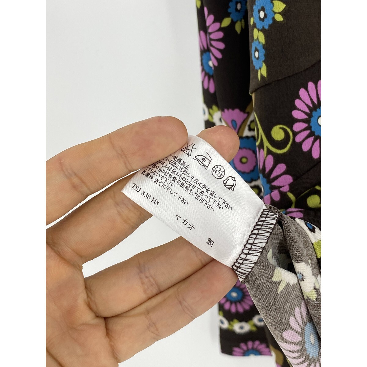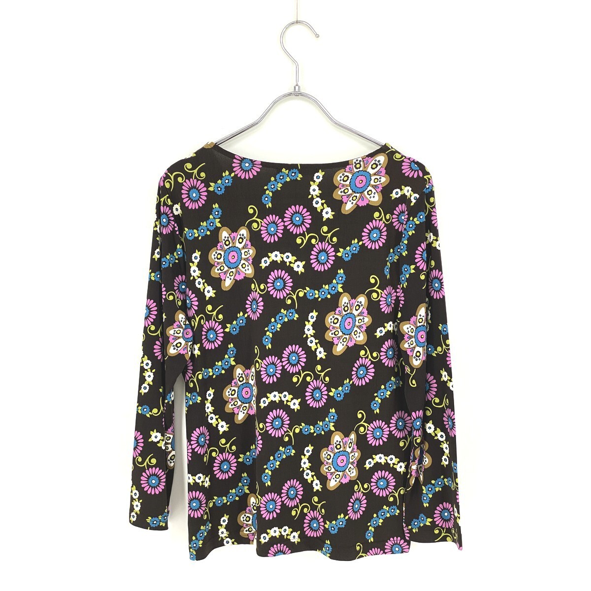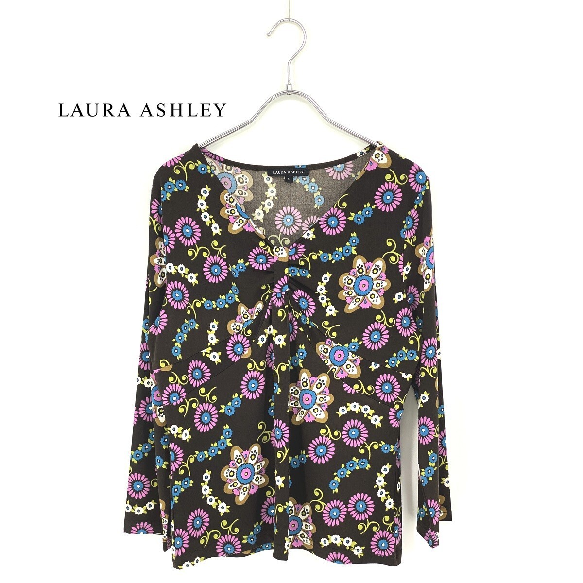 B0895/極美品 LAURA ASHLEY ローラアシュレイ ストレッチ ジャージー 総柄 花柄 ギャザー プリーツ 長袖 Tシャツ カットソーL茶 レディース