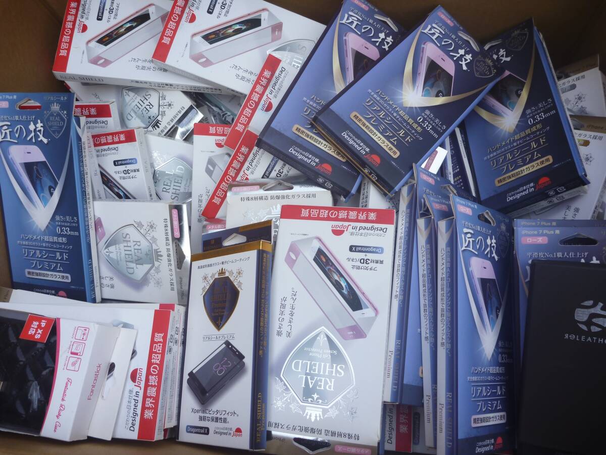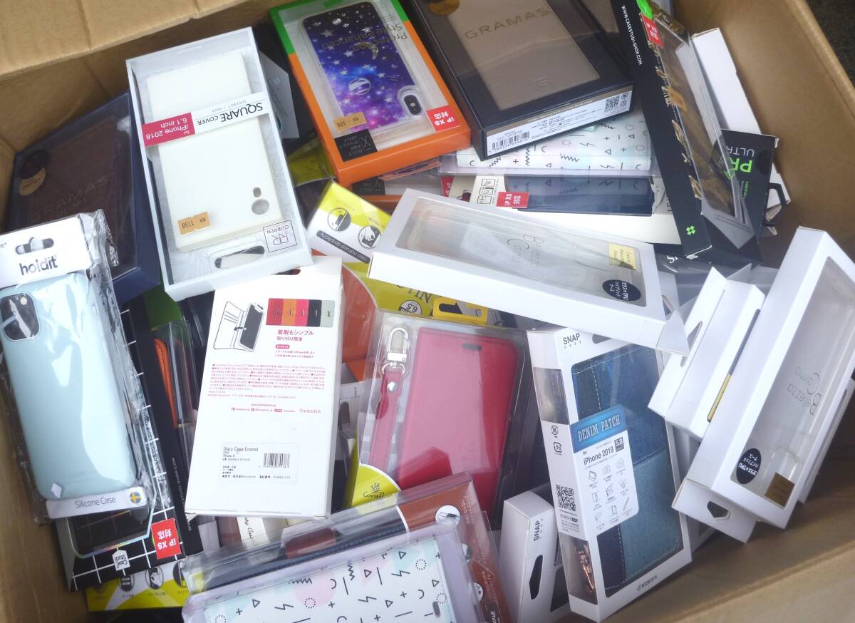 古い型のiPhoneケースや、保護フィルムなど大量に入っていますが未使用品と思われます。