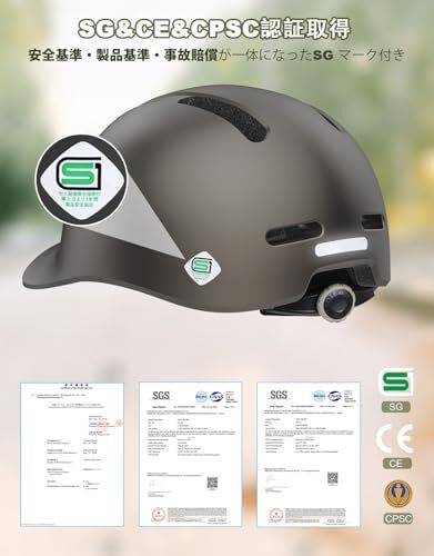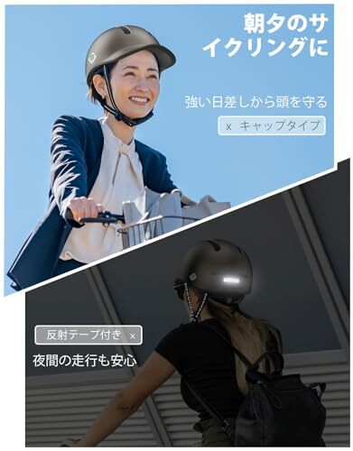 【朝夕のサイクリングに】ヘルメットはキャップタイプで強い日差しを防ぎ快適に使えます。ヘルメットの後ろには反射テープがあり、あごひもにも反射材が使われています、視認性を向上させ、夜道も安全です。安全と快適さを纏う、軽やかな都市型ライディングを