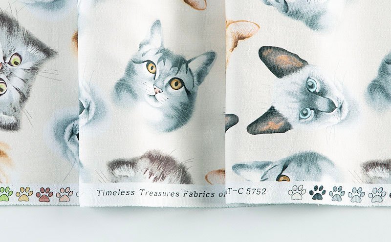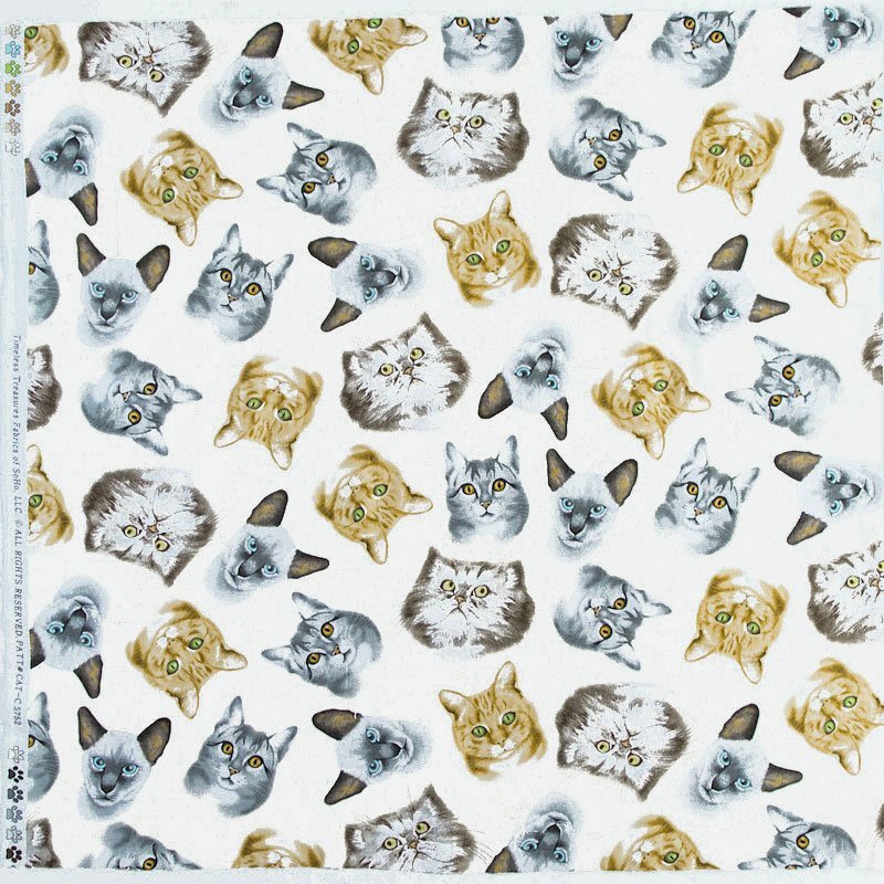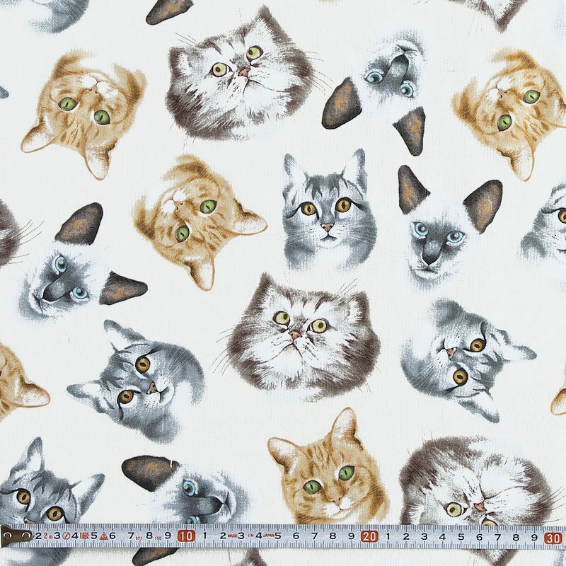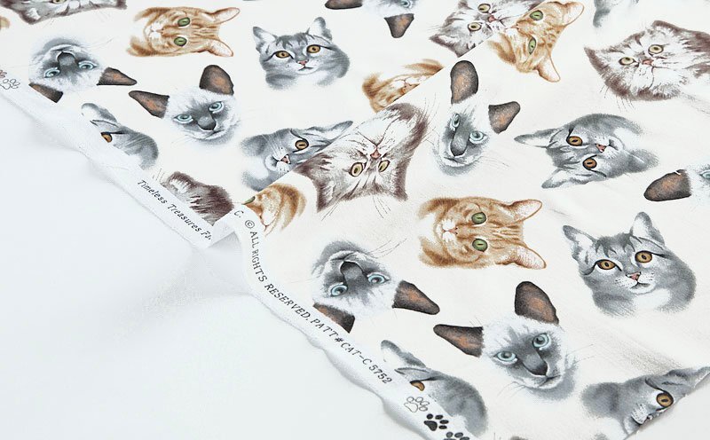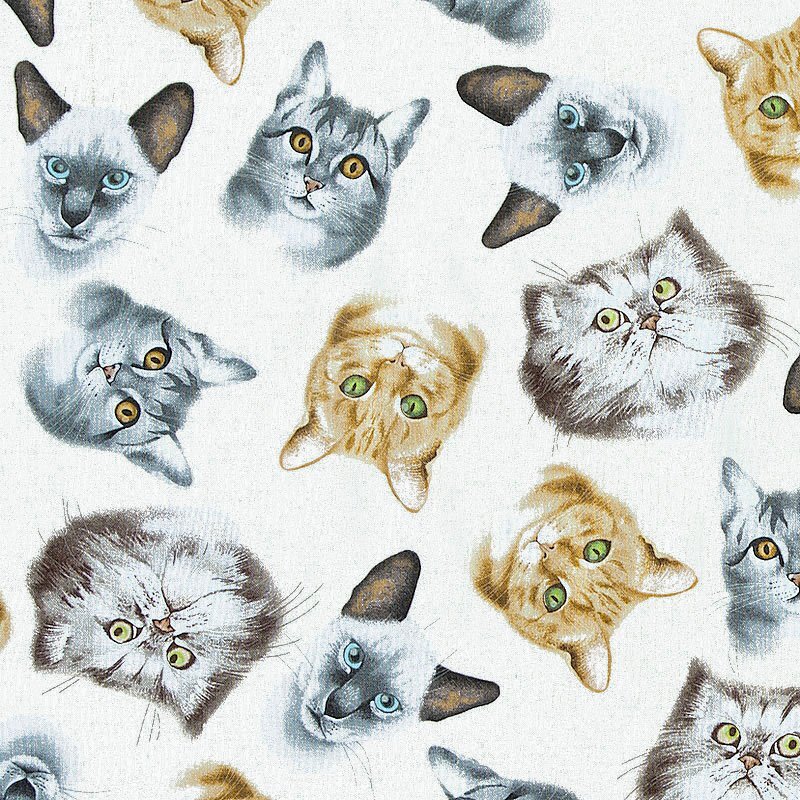 色々な種類のネコの首から上のポートレートが生地全体に散らばっています。