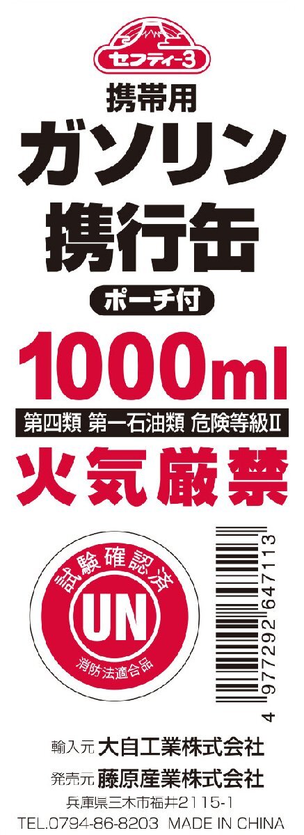 セフティ3 携行缶 ノズル付 携帯用 1000ml ガソリンアルミ携行缶 小型 草刈り機 芝刈り機 電動 充電式 エンジン式