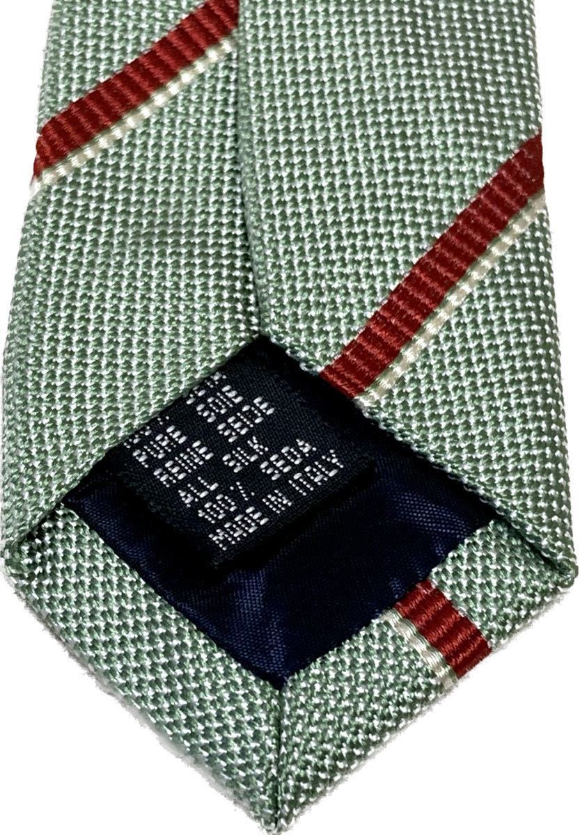 ■微光沢のライトグリーン地にエンジと白の細い斜めストライプが織り込まれたネクタイです。大剣部裏にロゴ刺繍があしらわれています。肌触りの良い上質シルク素材で出来ています。