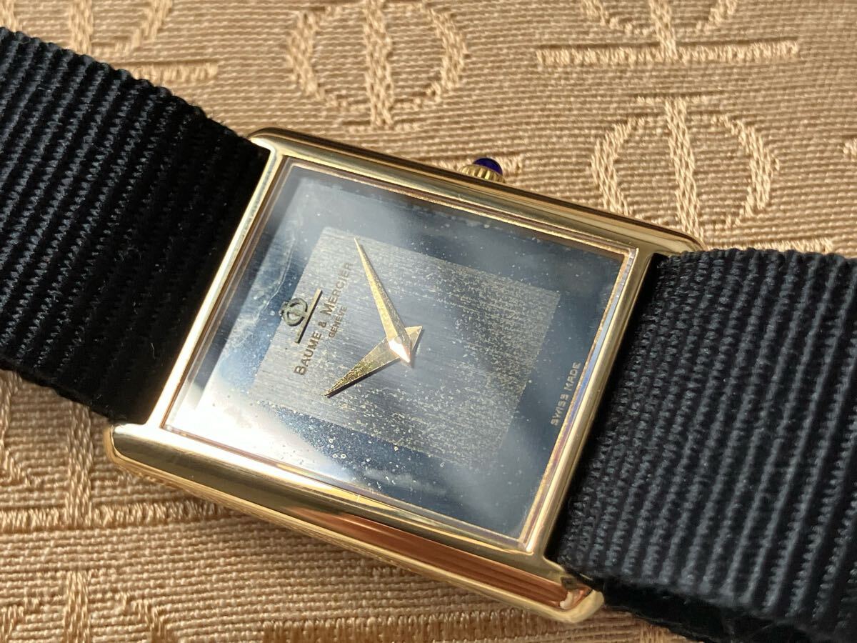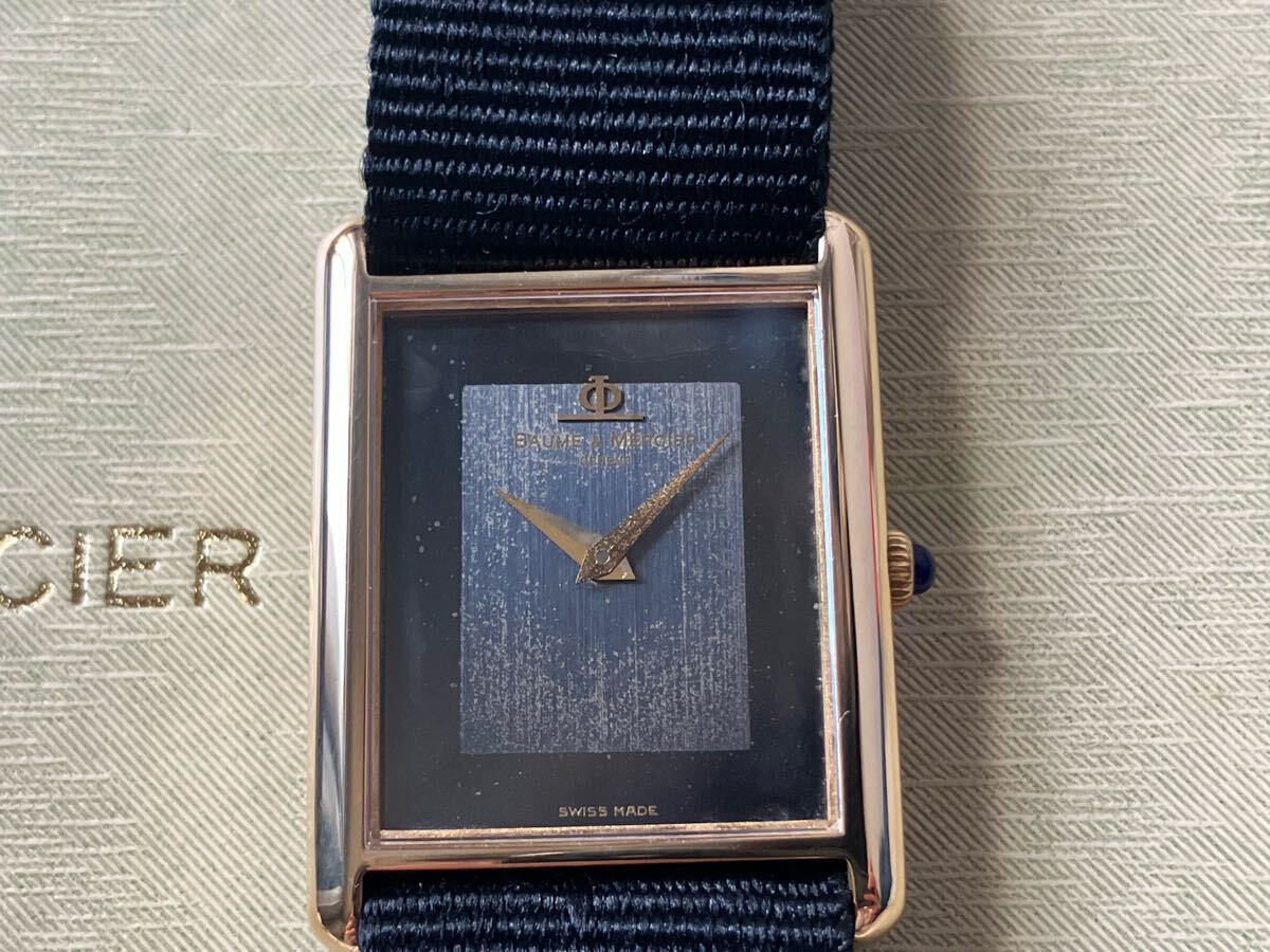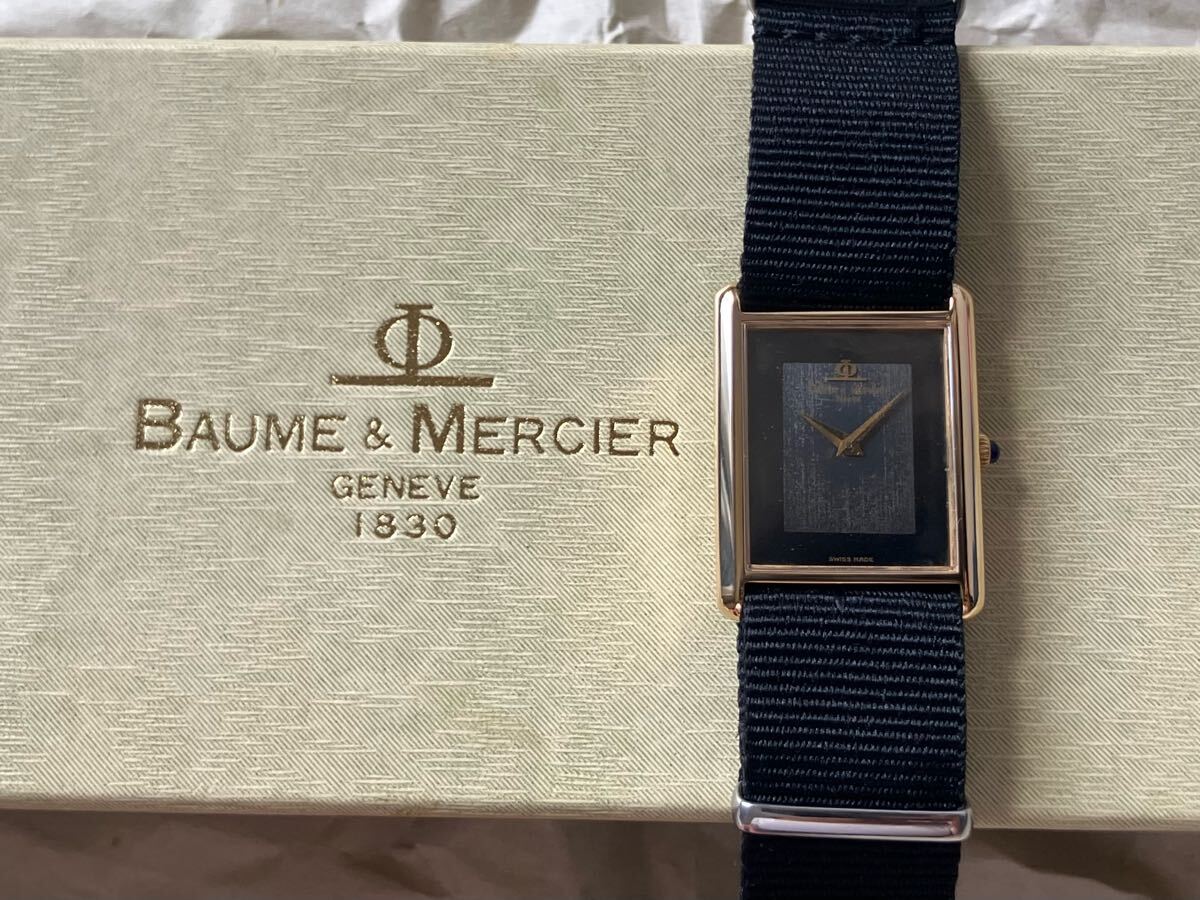 概要: ボームアンドメルシエの手巻き タンクモデルです。18金無垢のイエローゴールドのタイプで、ブラック系のツートン文字盤です。経年変化が発生しており独特の雰囲気があります。縦33.5mm×横25.5mmとカルティエのLMマストタンクよりも大きいです。
