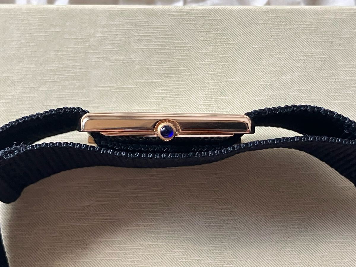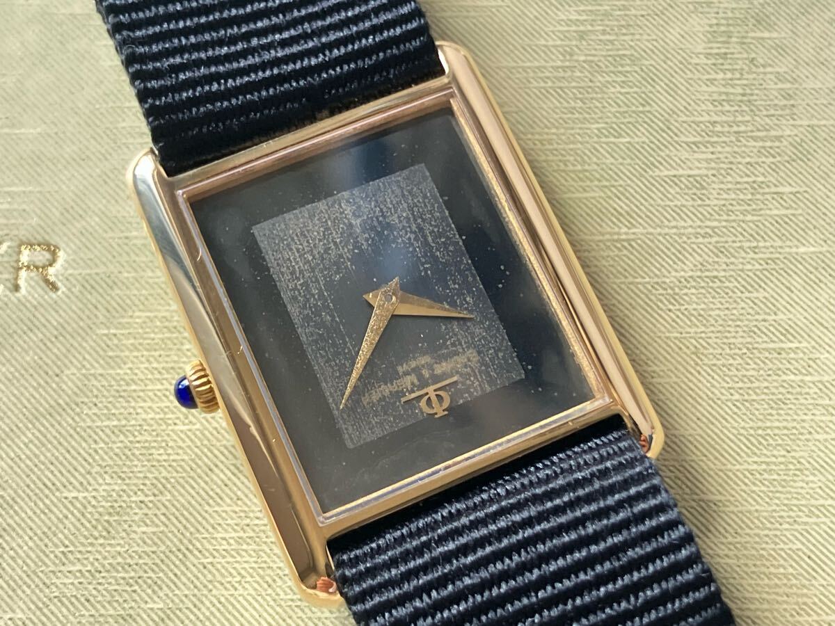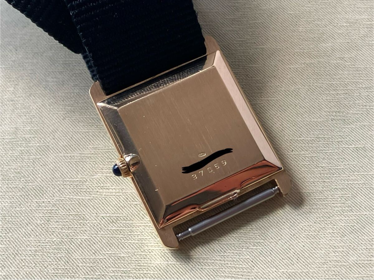 概要: ボームアンドメルシエの手巻き タンクモデルです。18金無垢のイエローゴールドのタイプで、ブラック系のツートン文字盤です。経年変化が発生しており独特の雰囲気があります。縦33.5mm×横25.5mmとカルティエのLMマストタンクよりも大きいです。