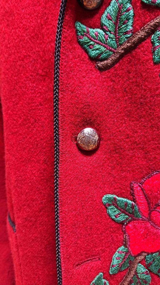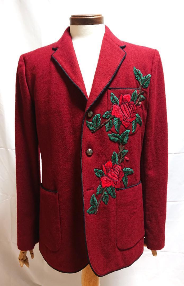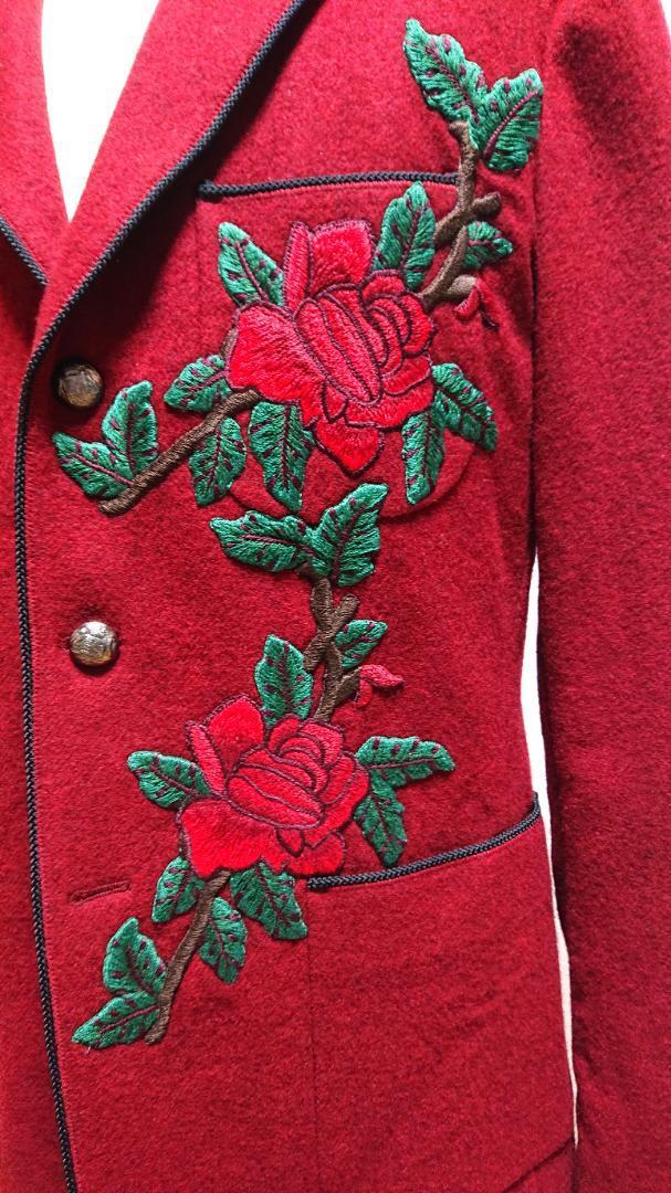 バーガンディの刺繍ブレザー、華やかなデザインが特徴。