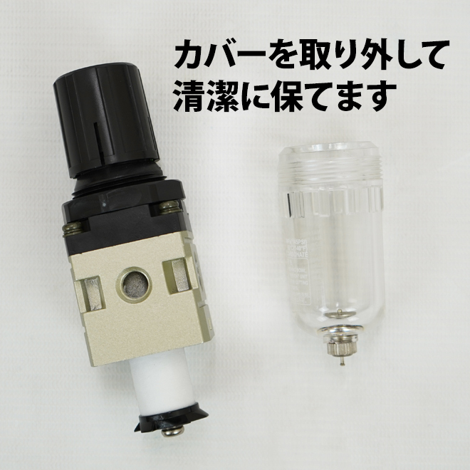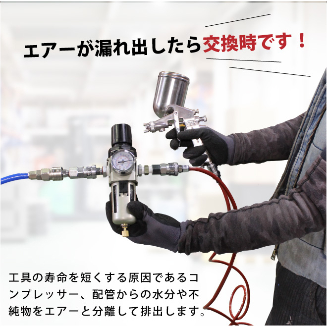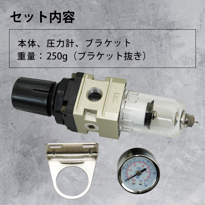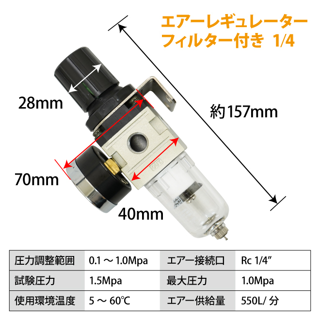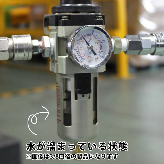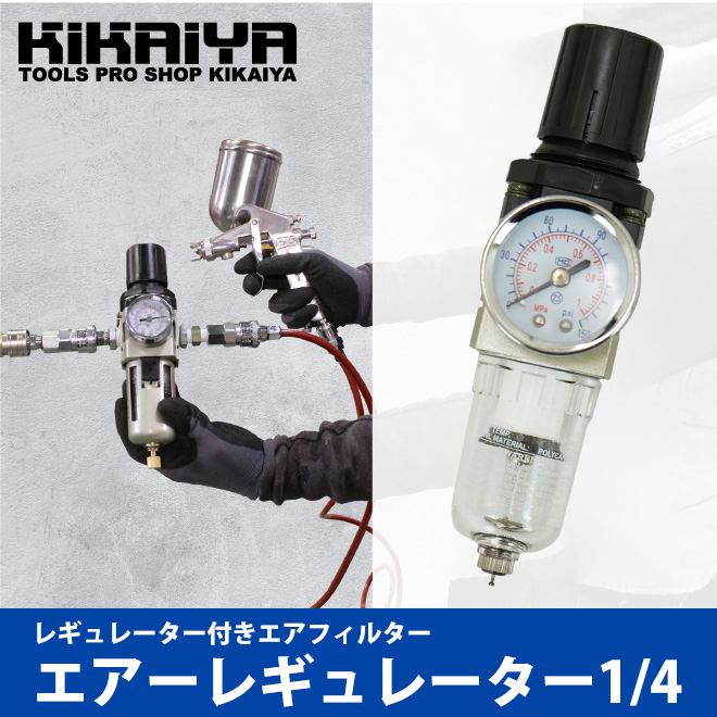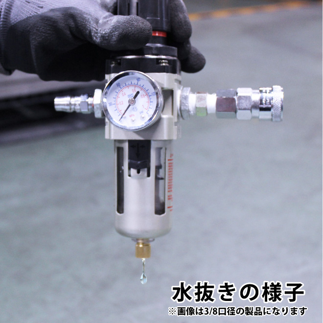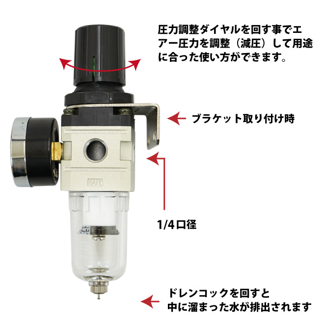 ・工具の寿命を短くする原因であるコンプレッサー、配管からの水分や不純物をエアーと分離して排出します ・圧力調整ダイヤルを回す事でエアー圧力を調整(減圧)して用途に合った使い方ができます ・1/4口径 |