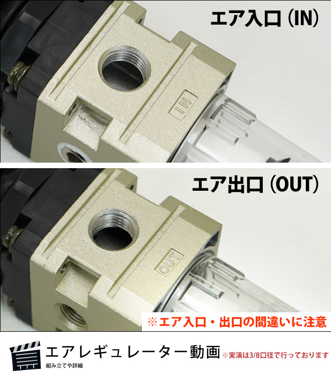 【 注意 】 ※一部イメージ画像に3/8口径の製品を使用しております サイズ・仕様等をご確認の上、ご注文をお願いいたします ※エアー「IN」「OUT」の接続間違いは、エアー漏れや設定圧不良の原因となります |