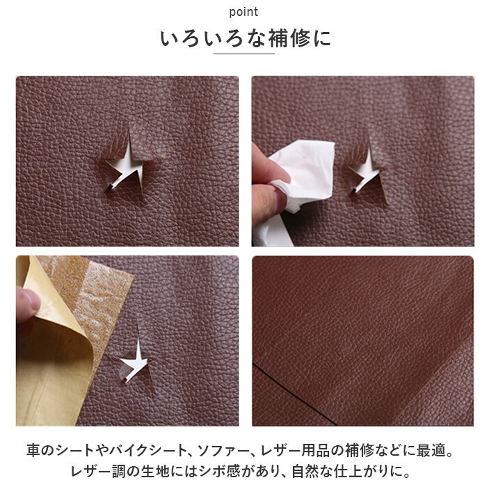 商品説明 | ・・ペタっと貼るだけでOK◎補修作業やインテリア用品などのアクセントに!「貼るレザー 20x30 5枚入り」が登場。 ・【ペタっと貼るだけ】 ・粘着部分のあるシールタイプなので、ペタっと貼るだけでOK。面倒な糊付けも不要、少ない工程で使えるので便利◎必要な大きさにカットも可能。 ・【いろいろな補修に】 ・車のシートやバイクシート、ソファー、レザー用品の補修などに最適。レザー調の生地にはシボ感があり、自然な仕上がりに。 ・【DIYにも】 ・補修だけでなく、DIYした家具やインテリア、アクセサリーなどのポイントやアクセントに使用するのもGOOD♪ ・【撥水◎】 ・嬉しい撥水加工。水濡れや汚れに強いのも嬉しいポイント。サッと拭き取れてお手入れも簡単! ・【5枚入り】 ・・5枚入りが登場。5枚入りなので、使用しなかった分はストックしておける◎大きすぎないので、狭い範囲の修繕や小物に使いたい場合に便利! ・【選べるカラー】 ・カラーバリエーションが豊富。お好みの色をチョイス! |