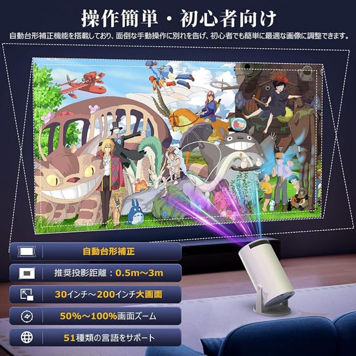 テレビがほしいけど、うちは狭い、テレビ置く場所ない。テレビだと高いぞ~。たまに家で映画館の雰囲気にしたいなぁ。大画面でゲームしたい。などなどの希望ございますか。では、お客様の要求にご満足いただけるお得かつ多機能な家庭用のプロジェクターをおすすめします。コンセントとWiFi、白い壁があればかなり小さな部屋でも視聴できます。機能・アプリが充実している小型プロジェクターは壁にも天井にも簡単にきれいな画面を映せます。更に日本語、英語、中国語、スペイン語など51種類の言語をサポートしており、どこの国のお客様でも簡単に操作できます。また、リモコンで遠隔操作できて、大変便利で、日本語説明書もあり、初心者でもお気軽にご利用いただけます。※リモコンを操作する時、本体に向けて操作が必要です。