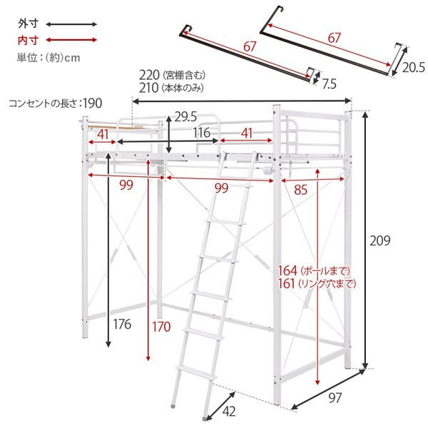 ※現在ご覧の商品ページはホワイトのご購入ページとなります。 ヤフオクの仕様上単一ページに複数バリエーションを掲載することができませんので、他バリエーションが希望の場合は別ページでご購入お願い致します。 ベッド下の空間に市販のカーテンを取り付け可能なパイプロフトベッド。 ハンガーポールもついているので衣類収納としても活躍。 ベッド下の空間がウォークインクローゼットや小さなお部屋として使えるスーパーハイタイプ 配達業者を指定いただくことはできません。 北海道/沖縄/離島のお届けに別途中継料金が発生します。 ※別途送料が発生する場合は後ほどご連絡させていただきます。 当店は正規店です。 タイミングによっては在庫切れの場合があります。