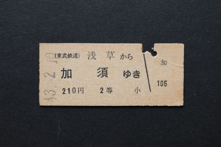 東武鉄道 乗車券 浅草から 加須ゆき 210円 2等