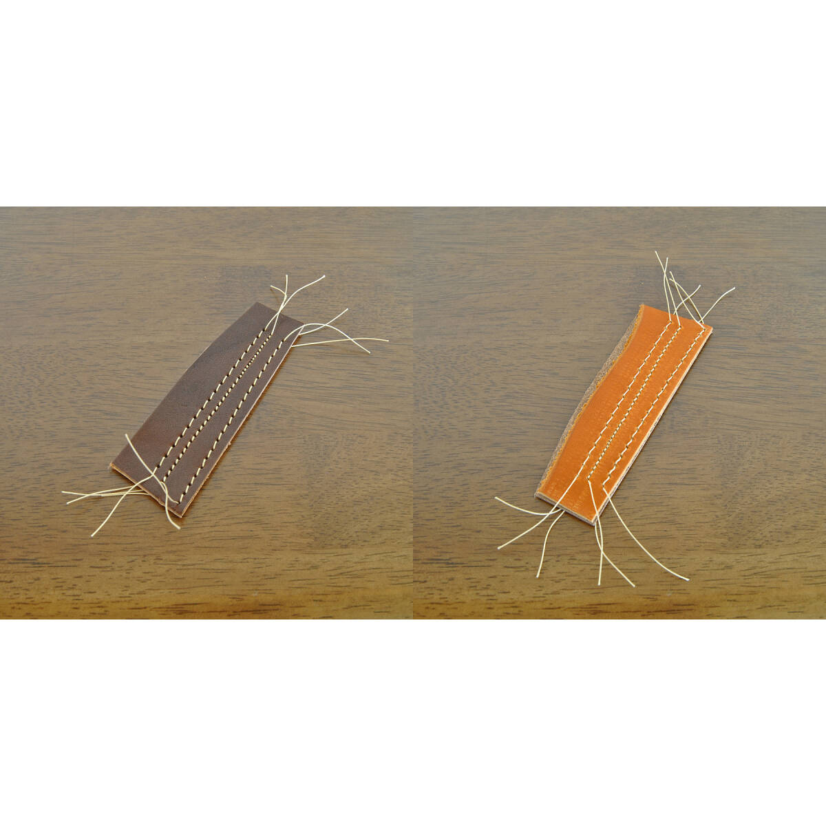 出品前に手回しでビニモ8番手を使用して約2mm位のヌメ革を2枚重ねて(約4mm位)試し縫いしましたが特に問題ないと思います。画像10枚目の左が表、右が裏です。はずみ車もスムーズに回ります。
