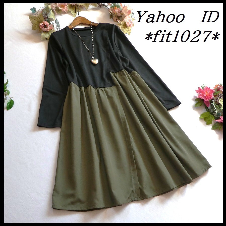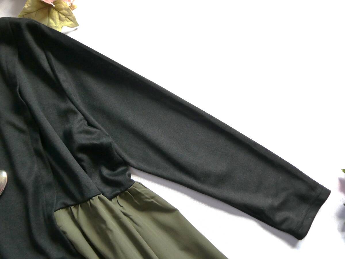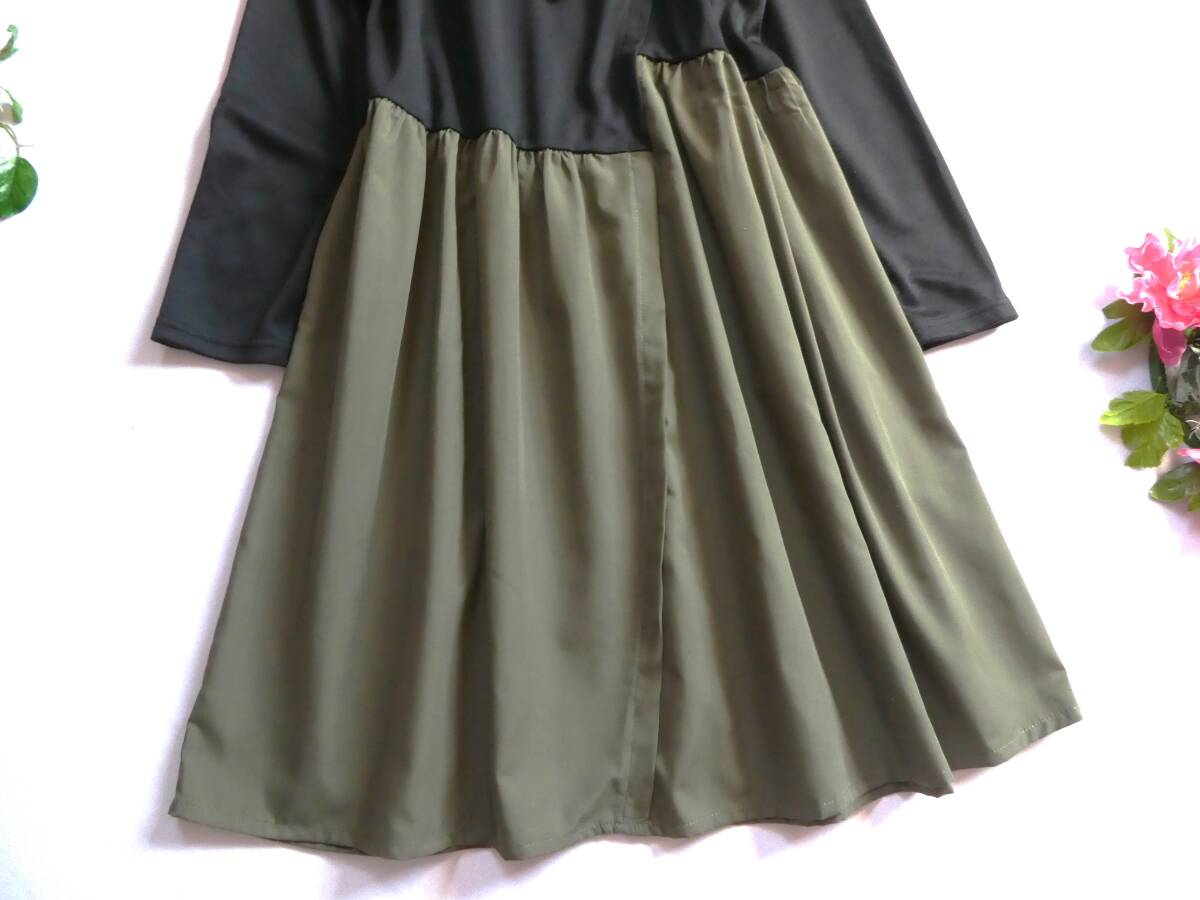 ゆったりサイズ【新品】秋~冬に◇異素材ドッキング☆アシメ&ギャザー切替♪★Aラインワンピ・チュニック★黒/カーキ◆fit1027◆