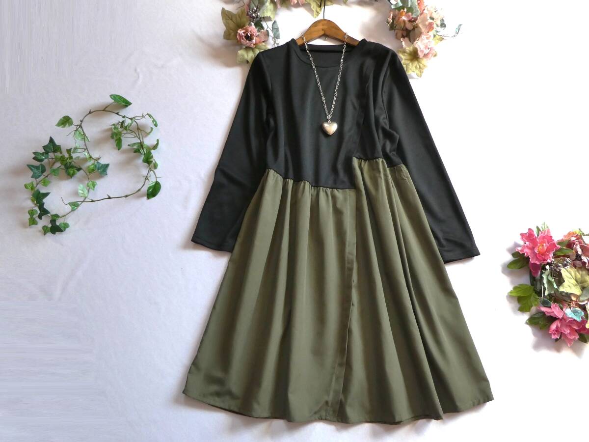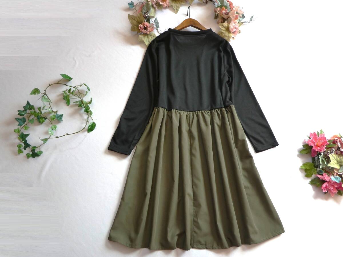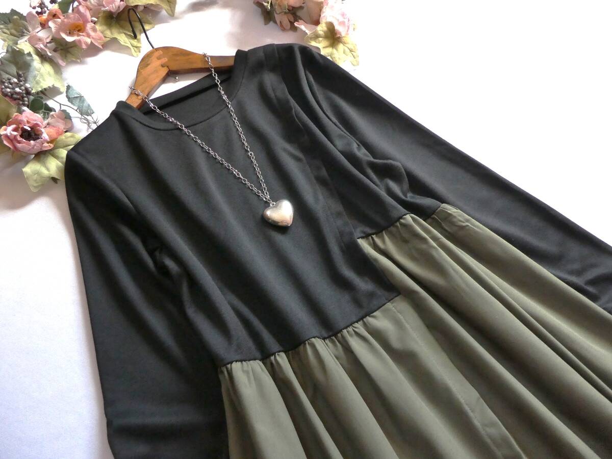 ゆったりサイズ【新品】秋~冬に◇異素材ドッキング☆アシメ&ギャザー切替♪★Aラインワンピ・チュニック★黒/カーキ◆fit1027◆