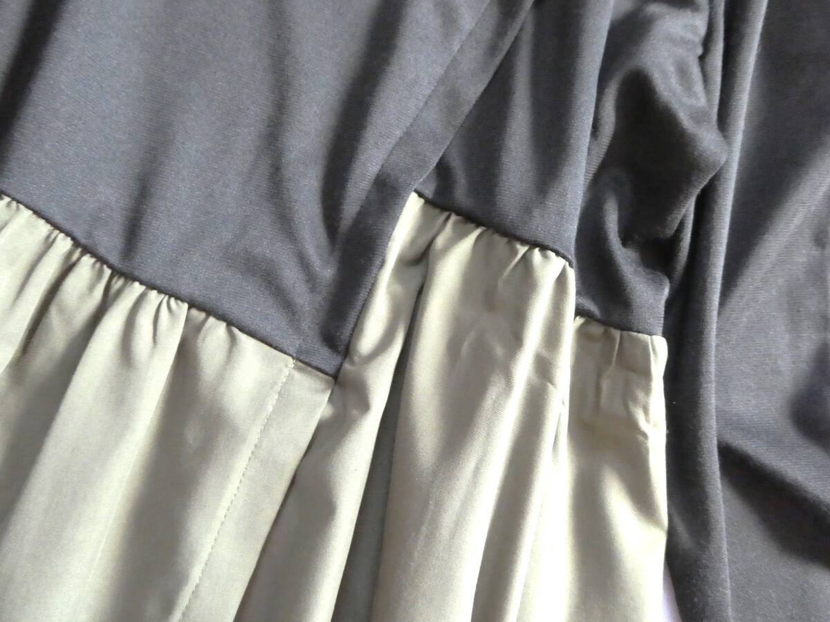 フロントは無地のカットソー、斜めに走るアシンメトリー切替えとギャザーが自然なドレープを作り、腰まわりをふんわりカバーのデザインです♪♪