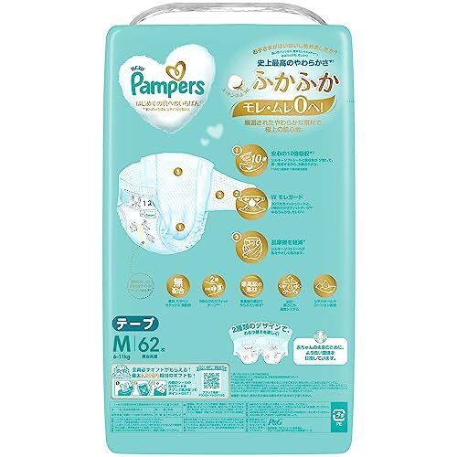 ・ M ・PatternName:1)新62枚(Mサイズ)・【NEW! パンパース 肌へのいちばん* テープ】コットンのようにふかふか 極上の肌心地。モレ・ムレ0へ! * '肌へのいちばん'以外の当社製品比・【限定増量】62枚パック・【NEW!クッション素材 かつてない**ふかふか心地】 パンパース史上最高**のやわらかさ 進化したWレイヤー構造により、極上のやわらかさを実現。 **当社国内向けテープ製品内比較。本製品販売開始時点において・【安心の10倍吸収】おむつ重量の10倍の尿を吸収。シルキーソフトシートと吸収体が分散して、即・吸収するから、お肌さらさら。・【Wモレガード モレ0へ!】3D穴あきメッシュシートと、2倍のびのび***フィットテープで、モレ0へ! *** 伸ばす前との比較