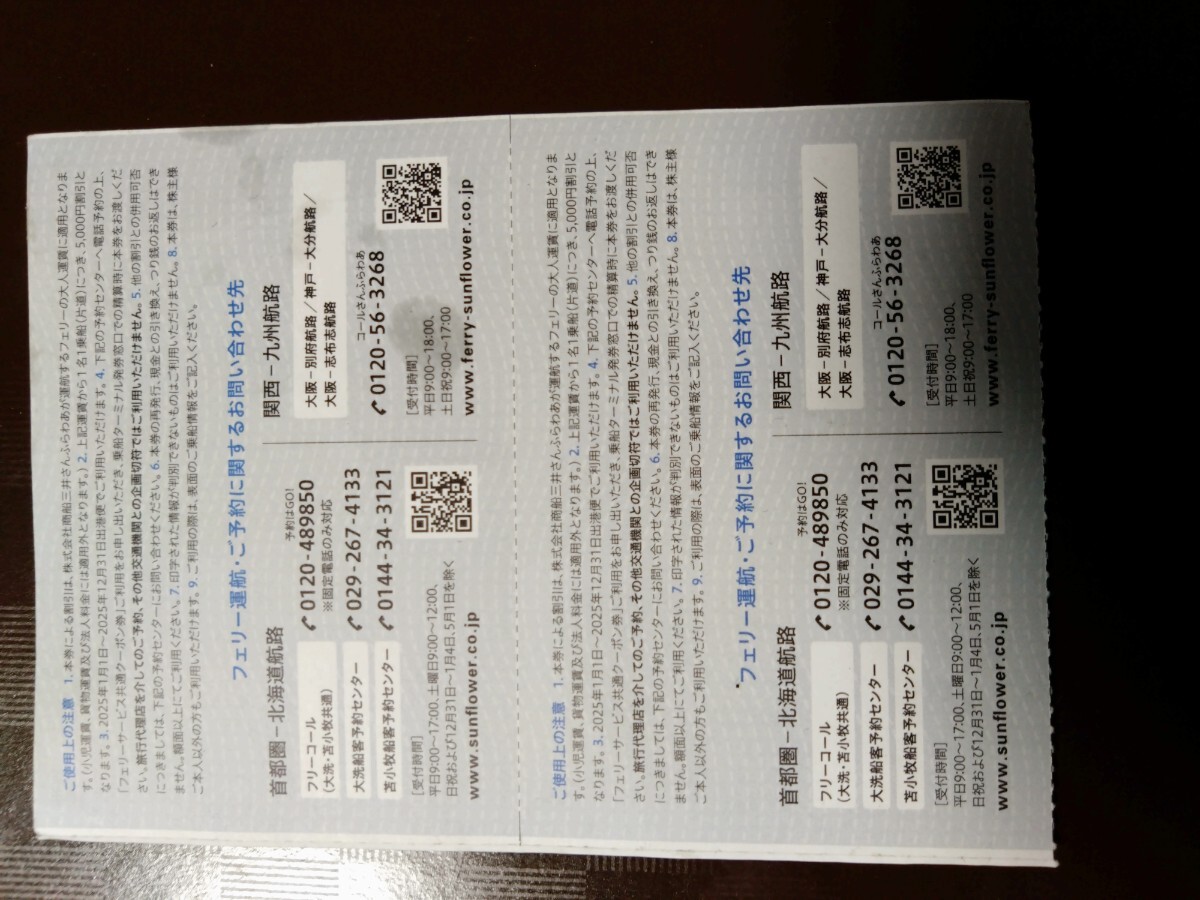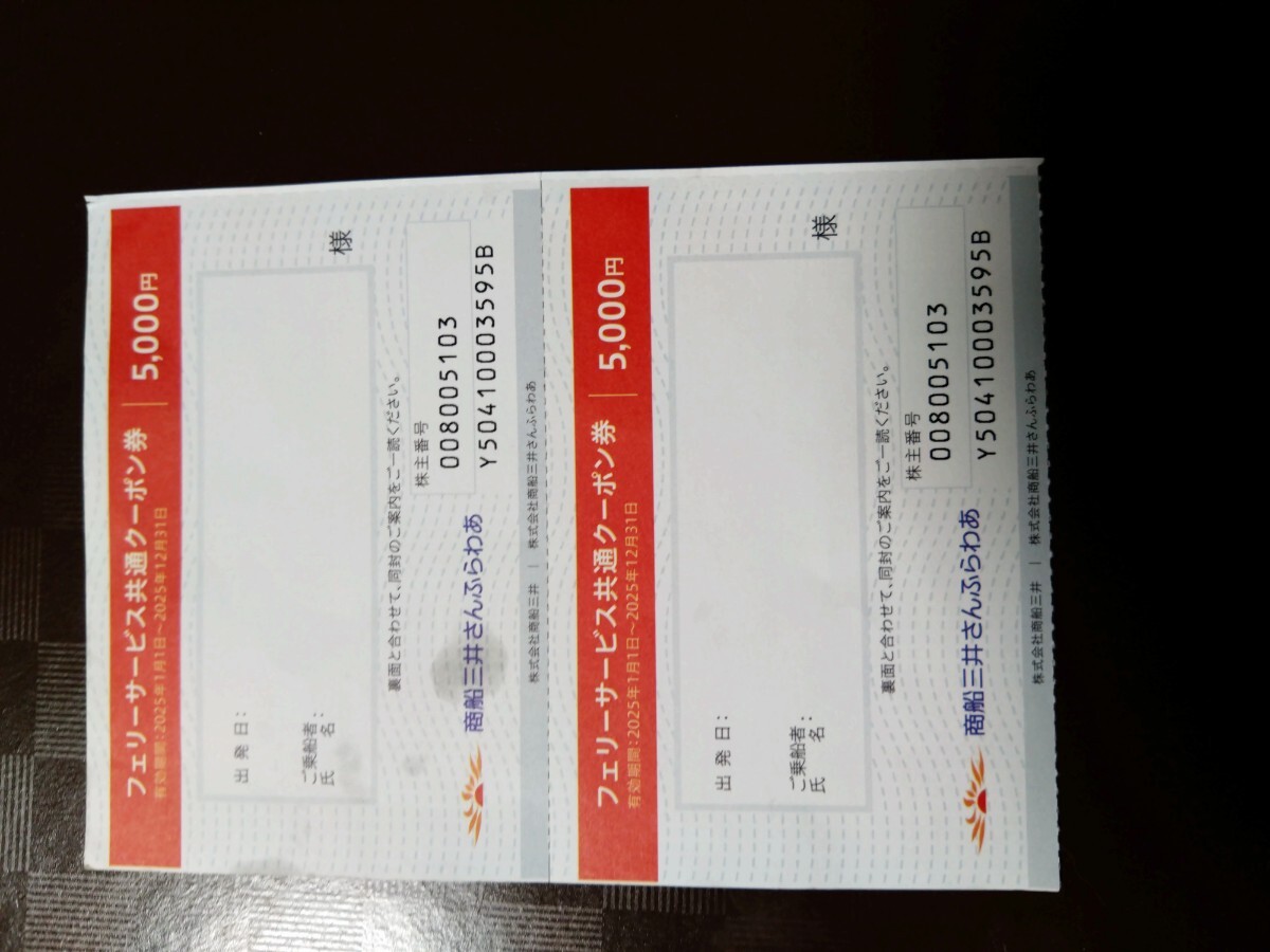 商船三井の株主優待券の商船三井さんふらわあ フェリーサービス共通クーポン券 5000円券 2枚組です。