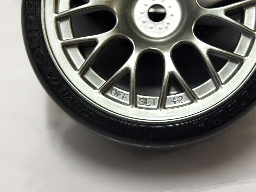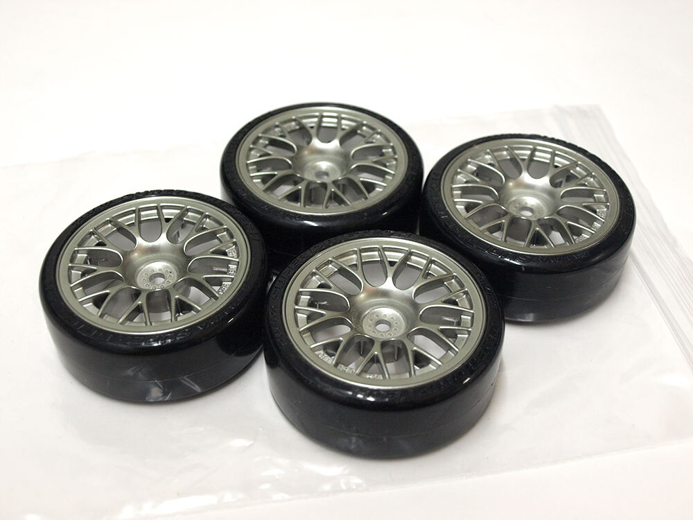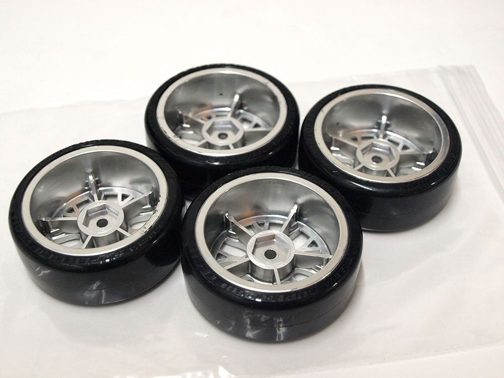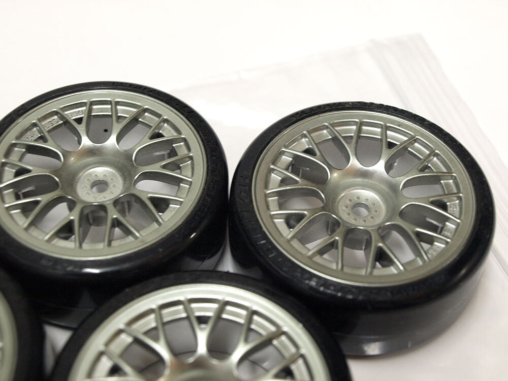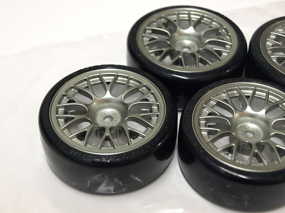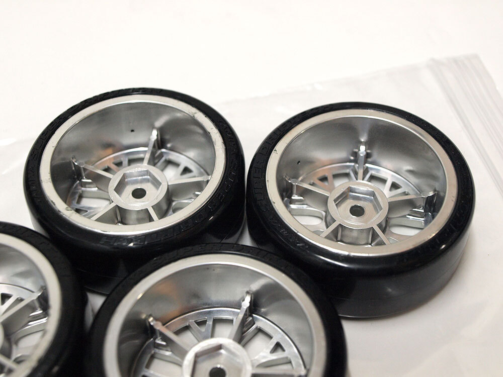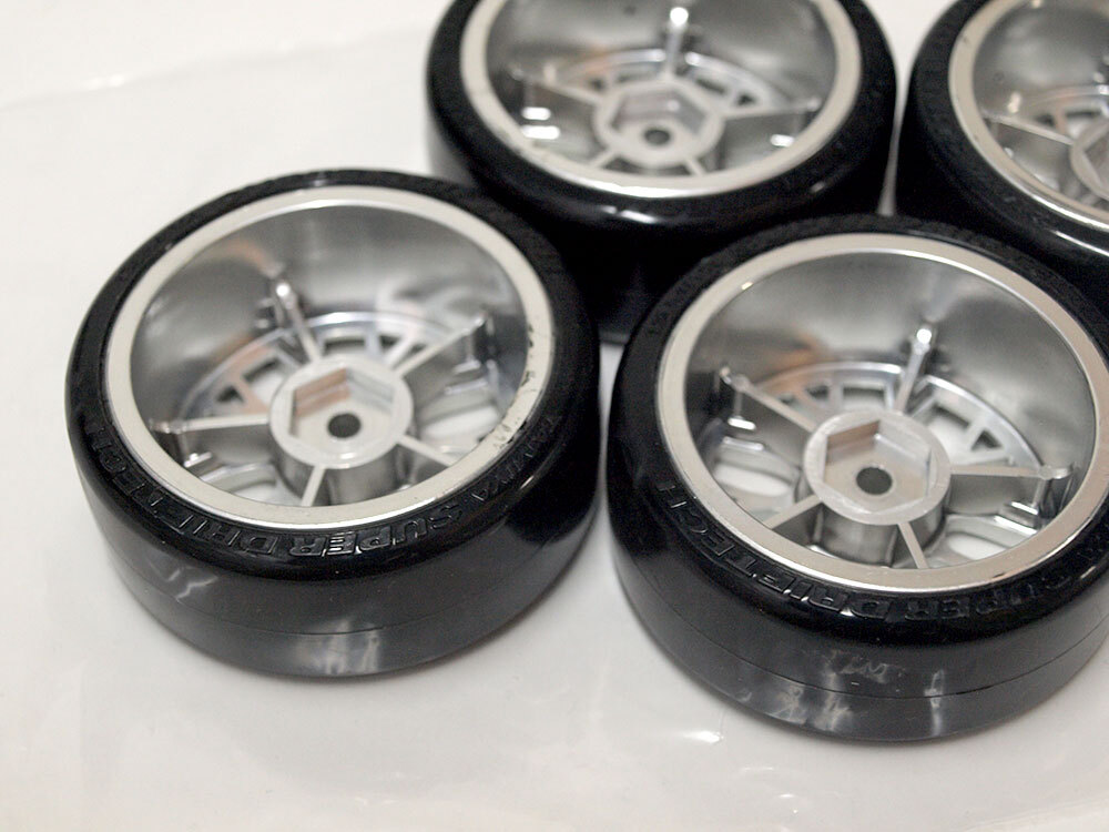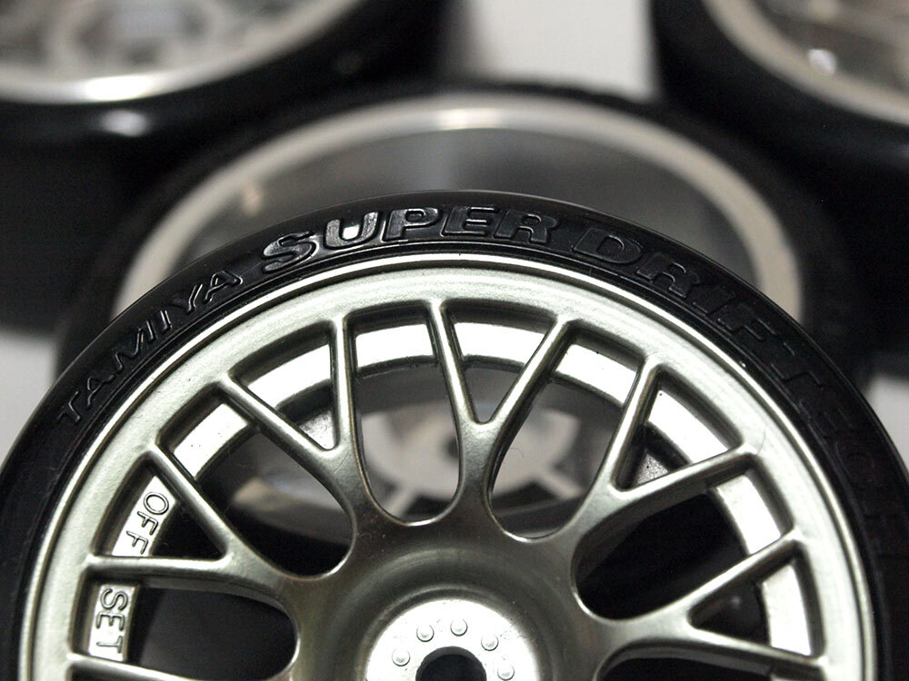 【M1824B】タミヤ ドリフト タイヤ 4個 中古品(ホイール SUPER DRIFTECH DRIFT オフセット+2 メッキ TAMIYA RC ラジコン)