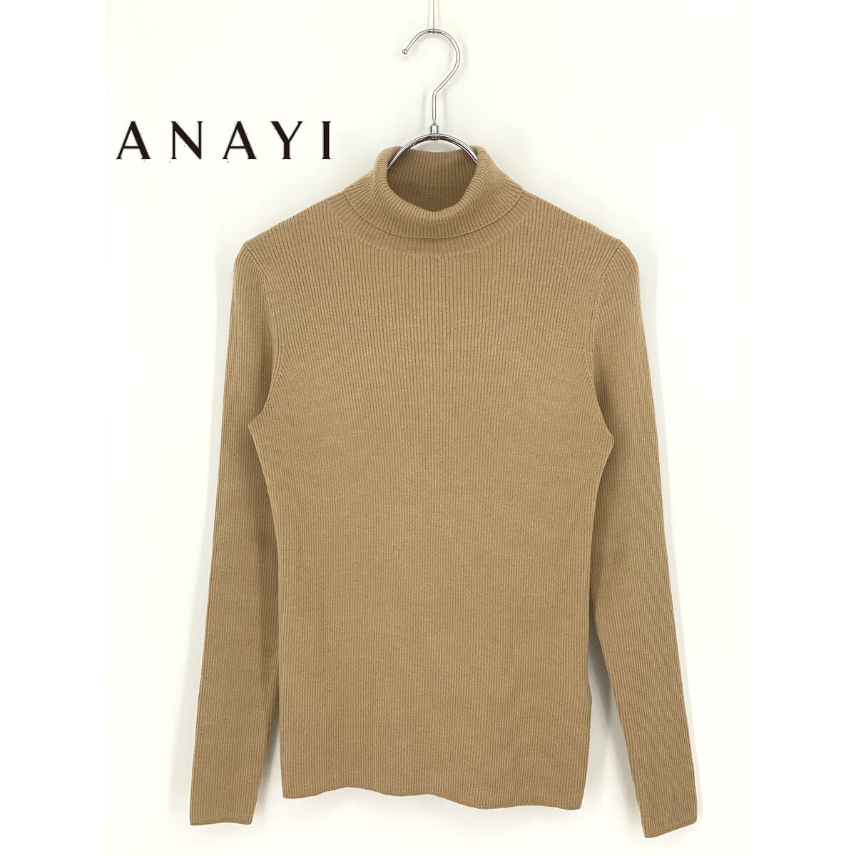 B0644/極美品 ANAYI アナイ ウール シルク 無地 タートルネック 長袖 ニット リブ セーター 38 M程 ベージュ 茶 レディース カーディガン