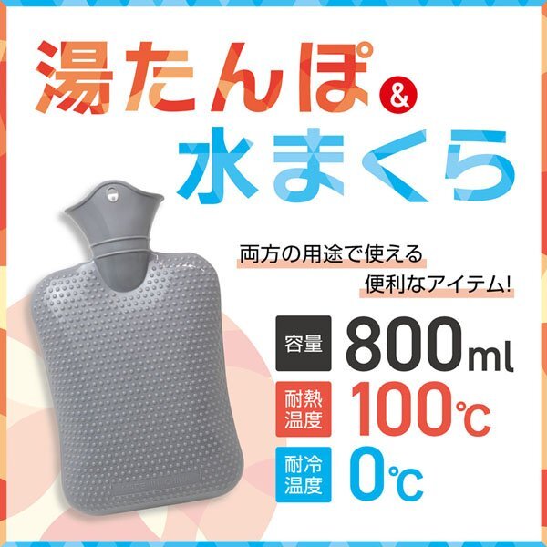 水まくら/湯たんぽの2WAYで使える! 1つでオールシーズン大活躍! 湯たんぽと水まくら、両方の用途で使える便利なアイテム! ■ 容量800ml ■ 100度 ■ 0度 ★ 湯たんぽとして 布団を温めたり、お腹を温めたいときにご使用いただけます。 ※ カバーは付属しません。 ★ 水まくらとして 夏の暑さ対策や熱冷ましにご使用いただけます。 ※ カバーは付属しません。 コンパクトながらも大容量! オールシーズンあらゆるシーンで活躍します♪