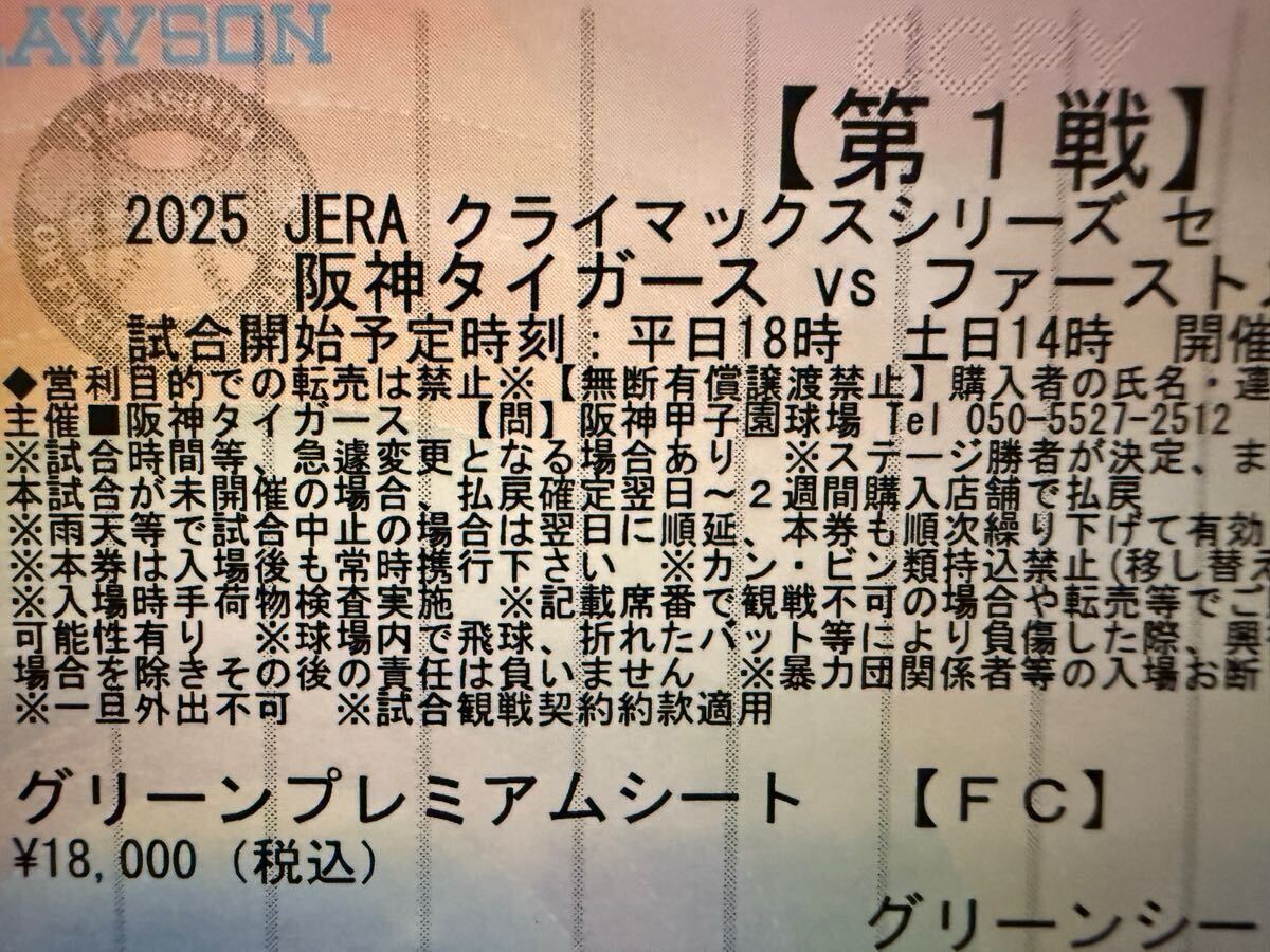 【商品名】2025 クライマックスシリーズ ファイナルステージ セ・リーグ 第1戦 阪神タイガースVS FS勝者 グリーンプレミアムシート ペアチケット 通路横から2席
