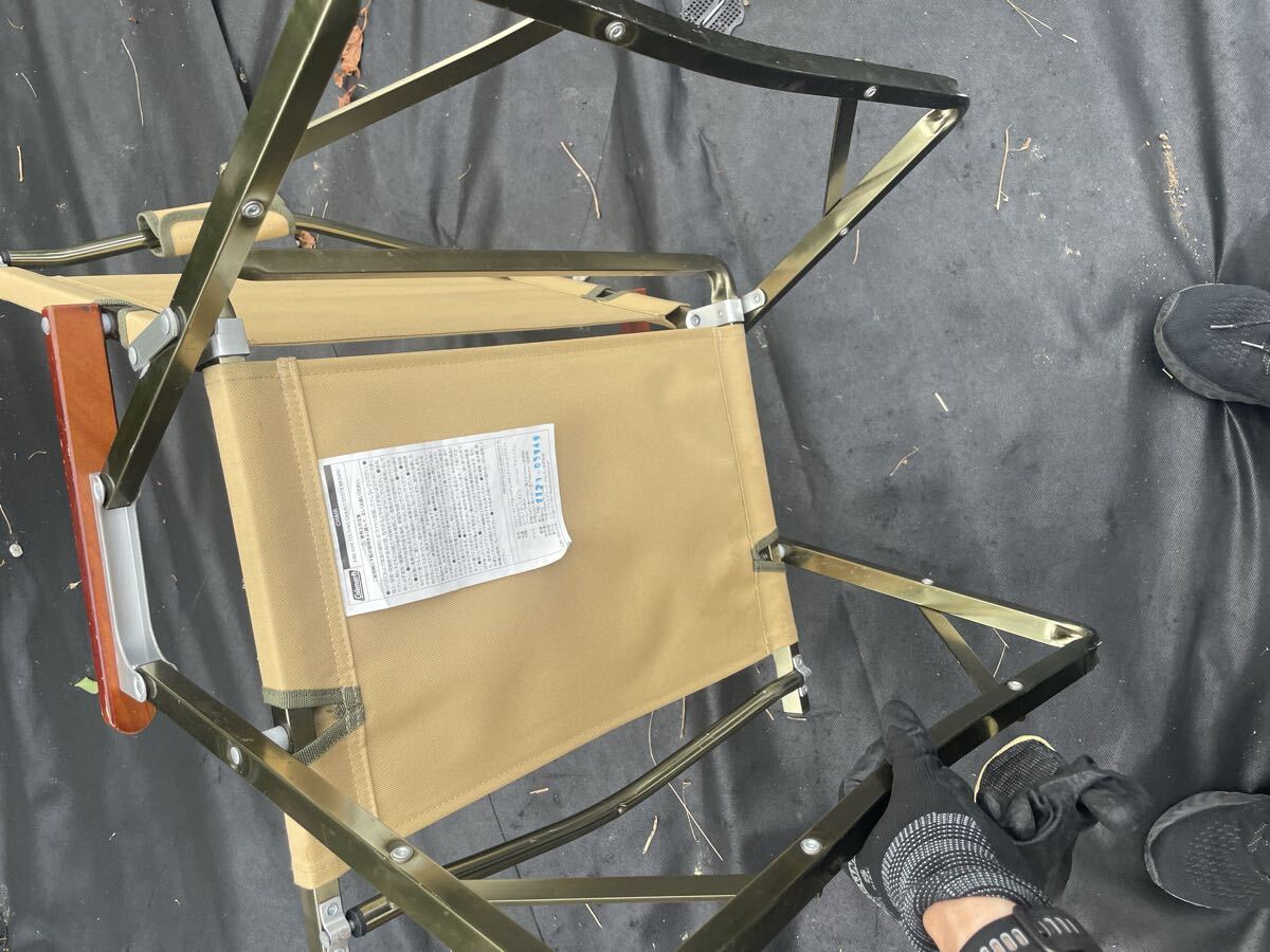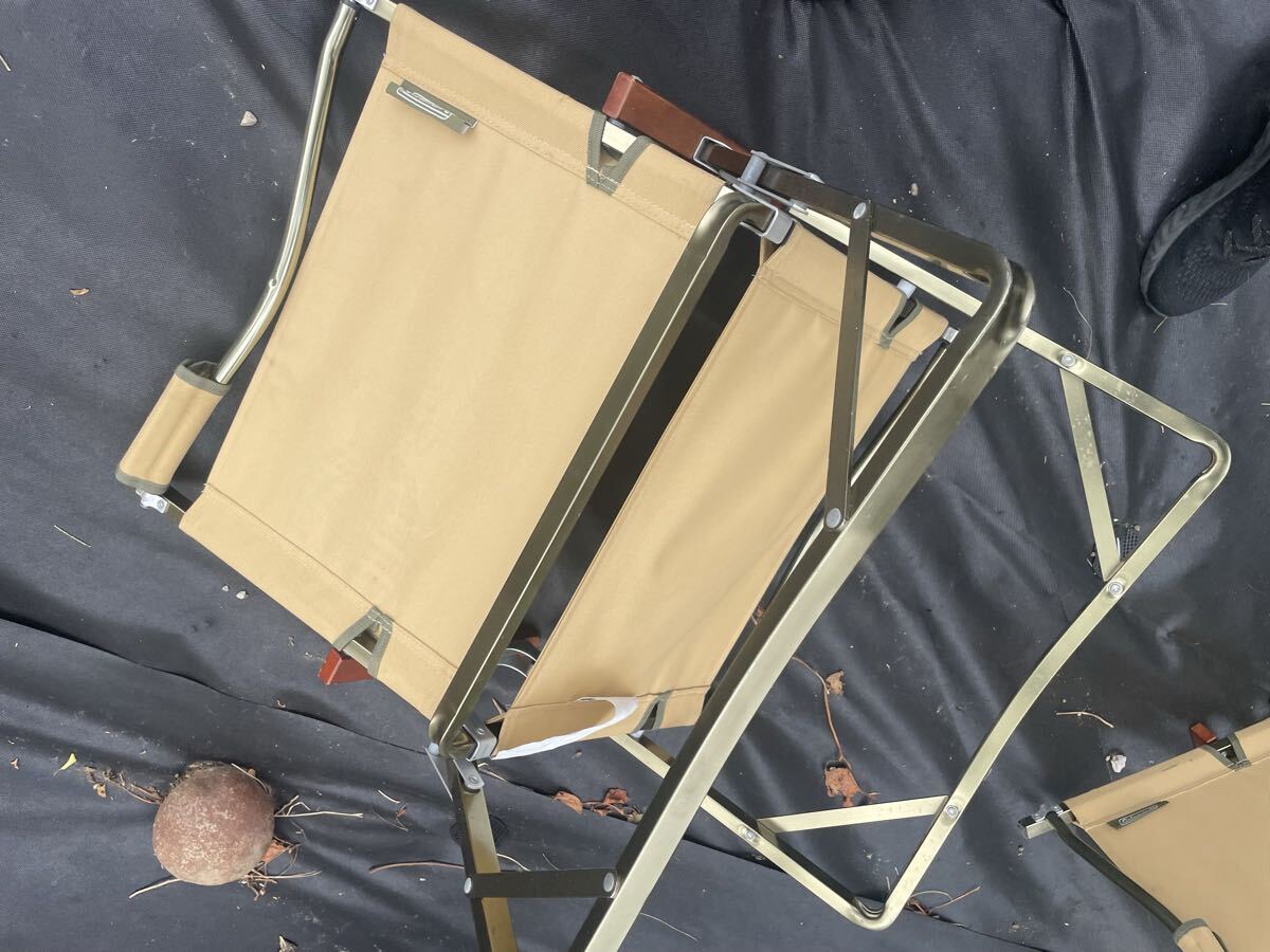 落ち着いたコヨーテブラウンのファブリックと天然木アームが特徴で、焚き火シーンにも適した難燃素材シートを採用しています。
