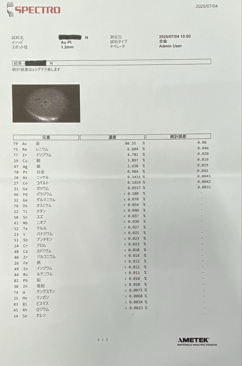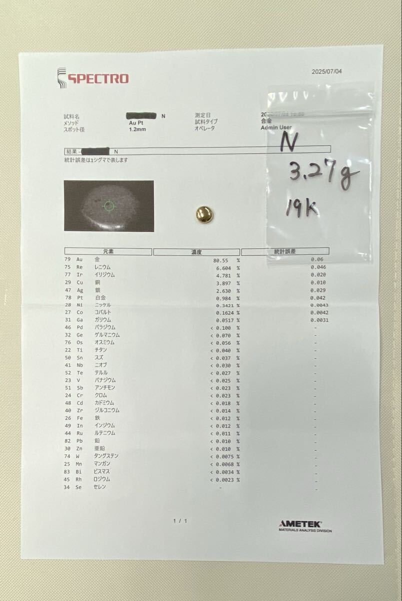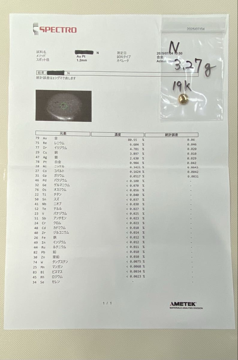 蛍光X線成分分析装置は全体を測るものでは無く、平らな箇所を点で計測しているとの事です。値の正確性を考慮してご判断下さい。検査結果表の黒く塗り潰してあるのは検査依頼の際、個人名の為。Nとなっているのは、依頼した製品が複数個ある為の識別記号として表記してあります。