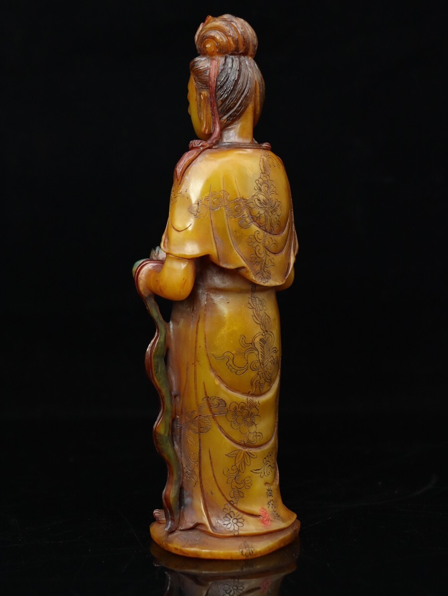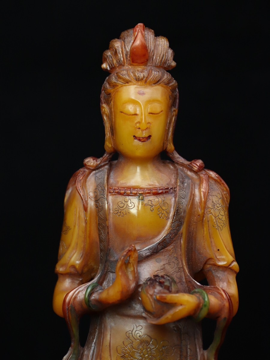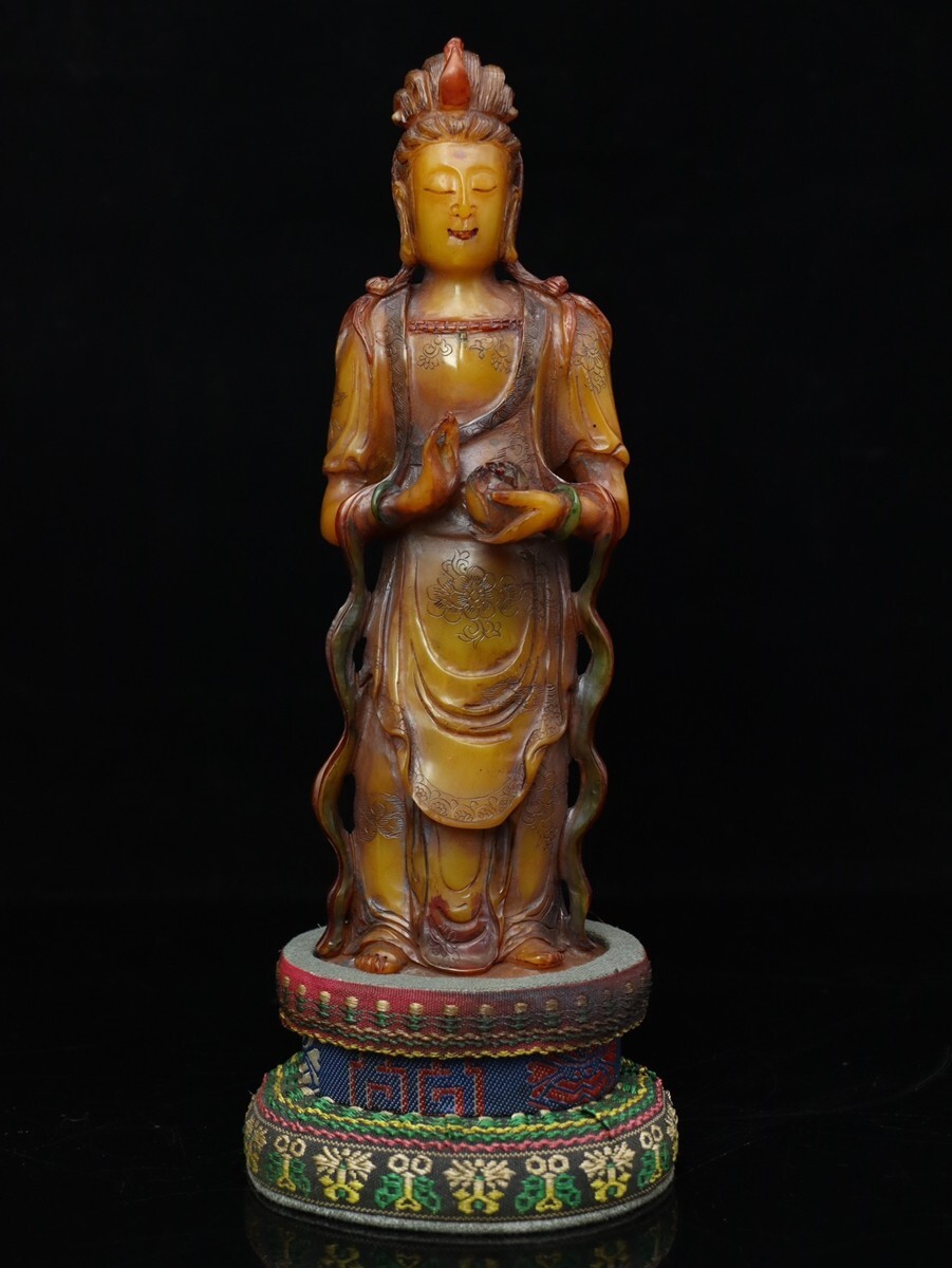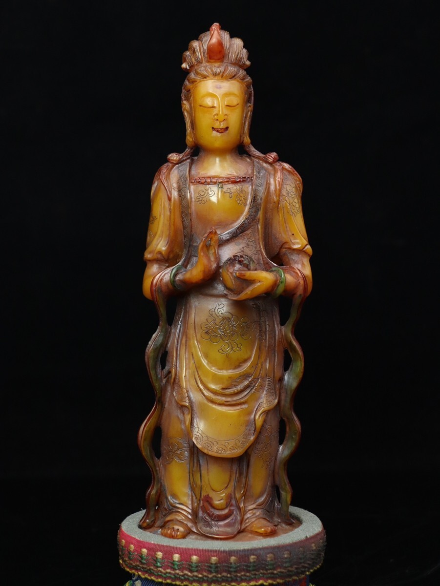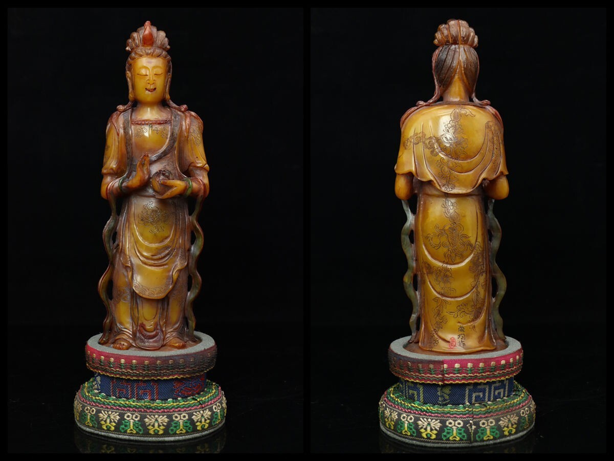 「清 尚均作 老寿山石 田黄石彫り 観音立像」極細工 擺件 古賞物 中国古美術 旧蔵出