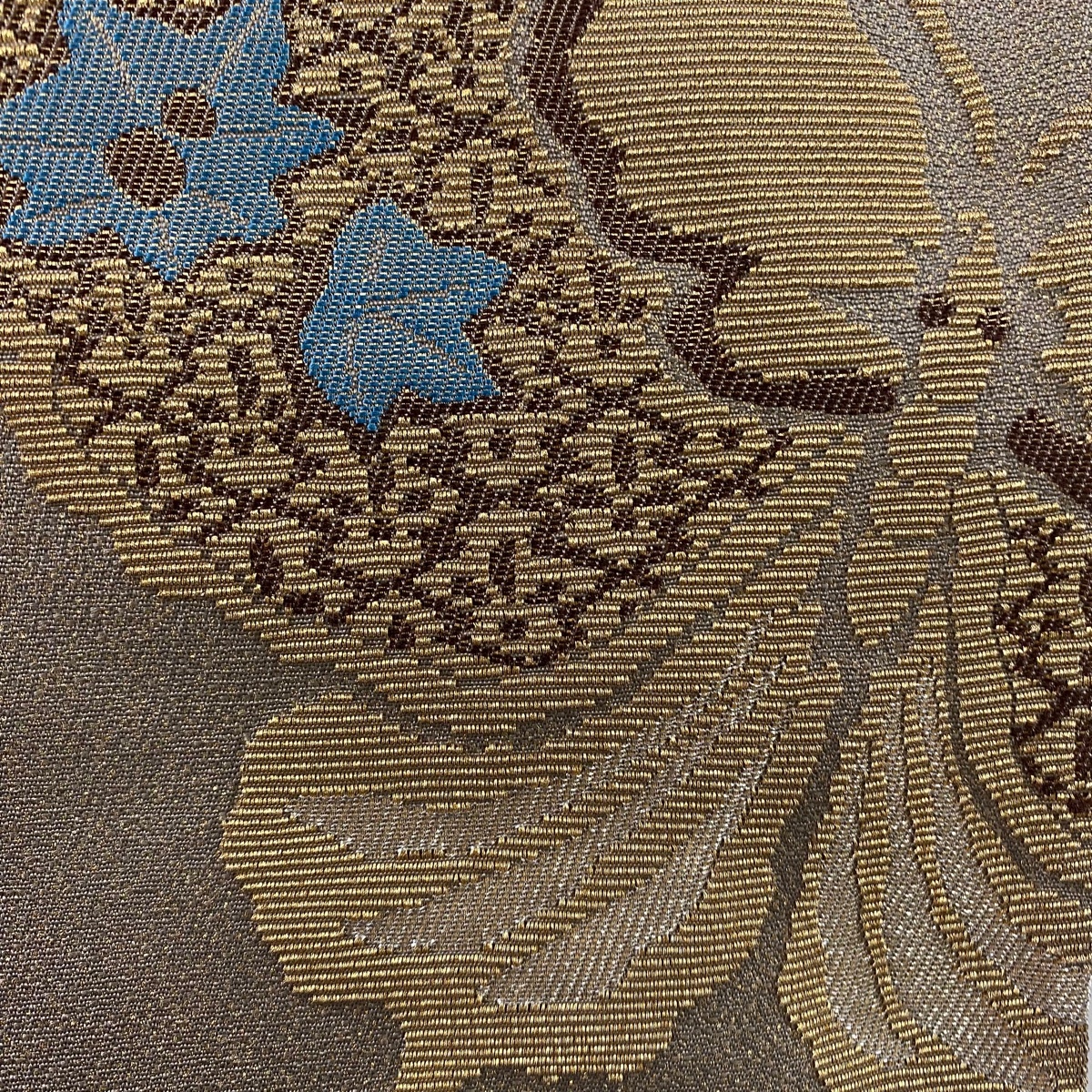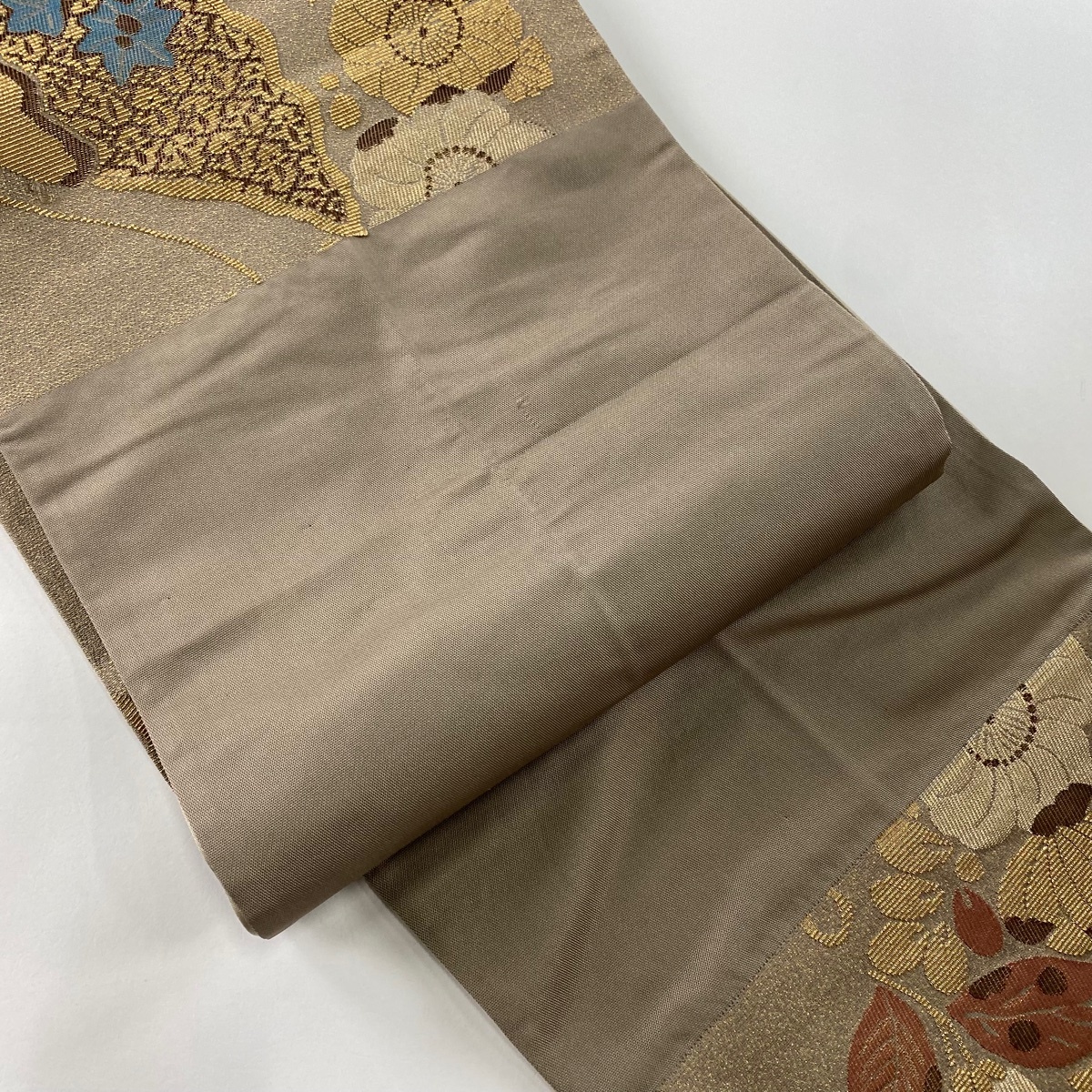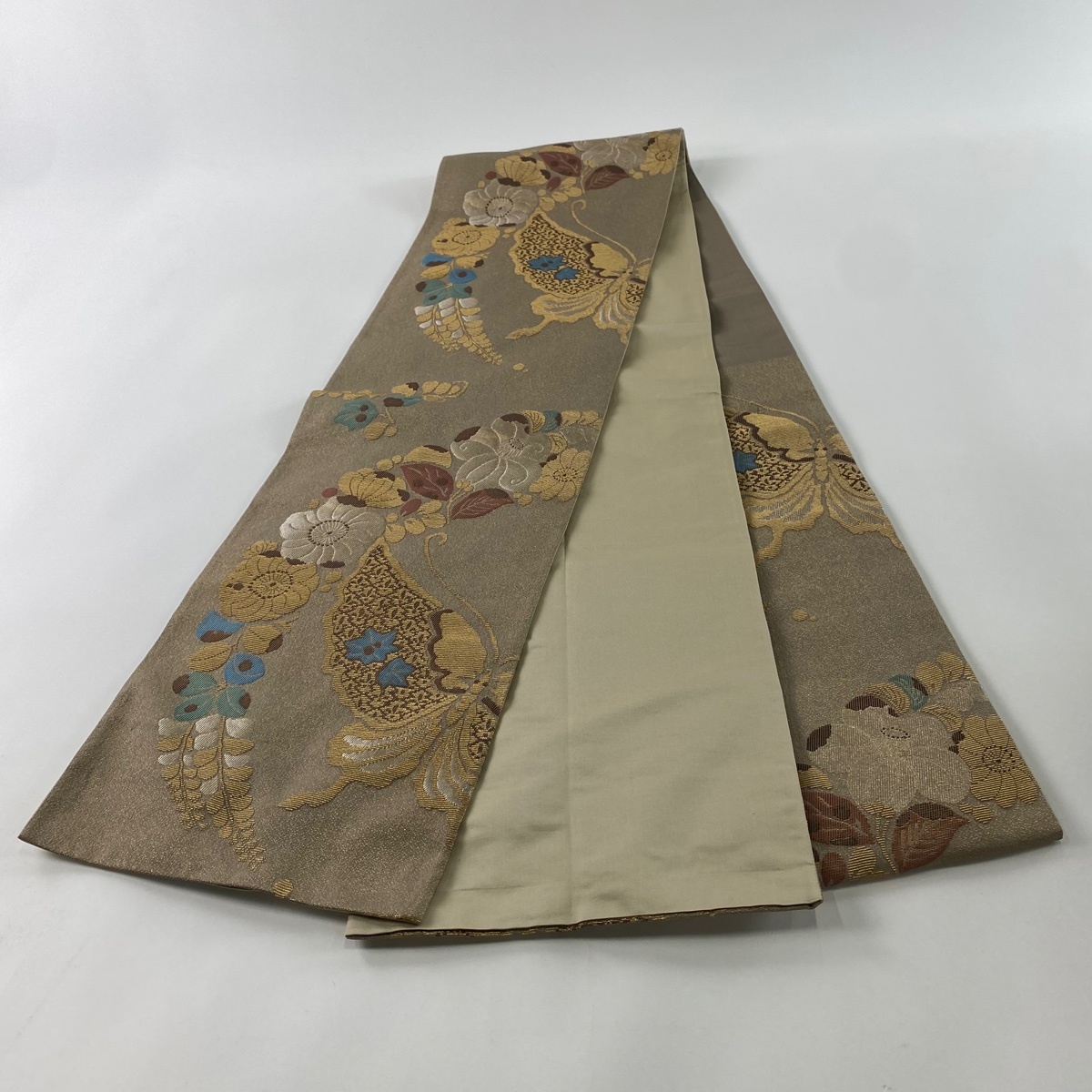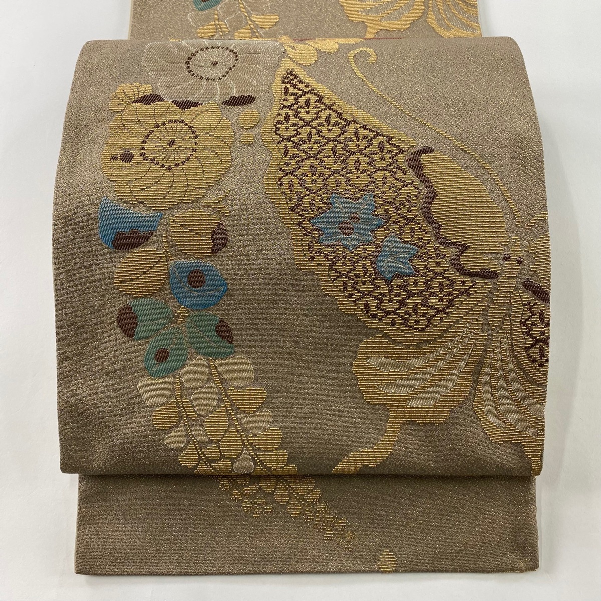 | 袋帯 名品 落款 草花 蝶 金糸 輪奈織 薄茶色 六通 正絹 【中古】 |