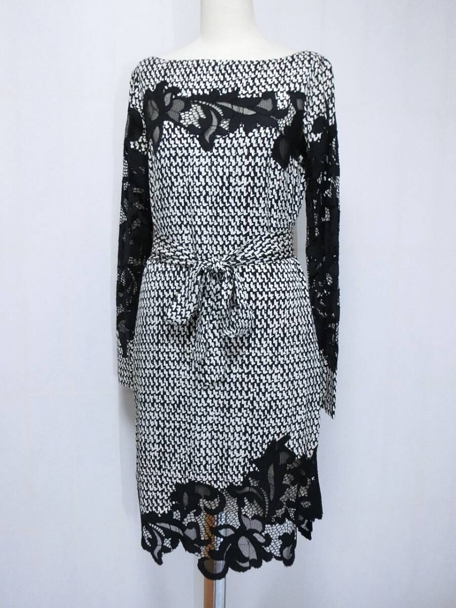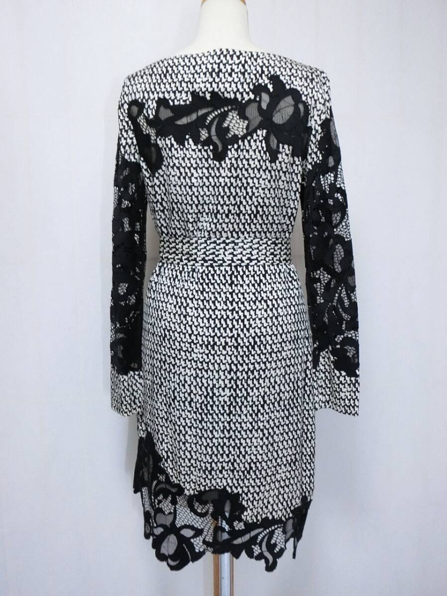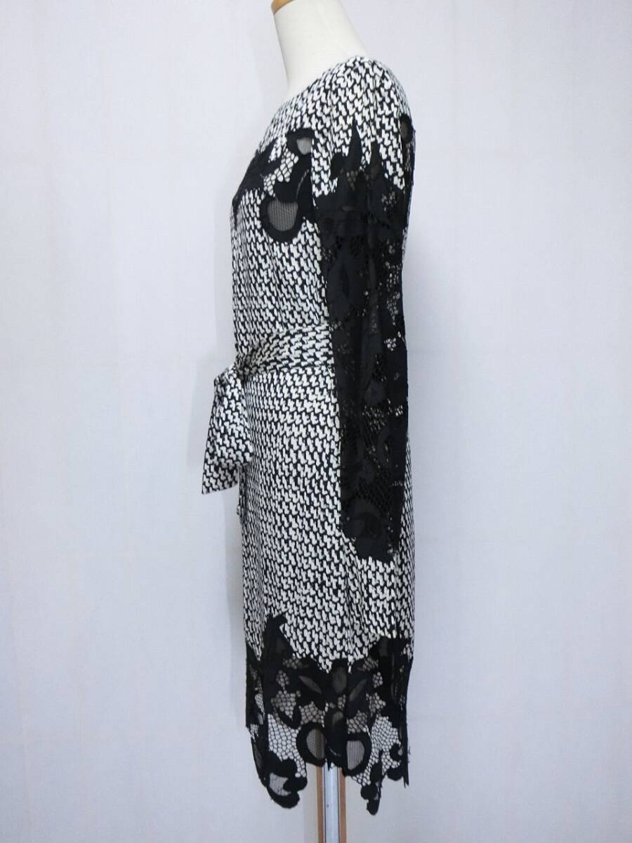 ★DIANE von FURSTENBERG ダイアン・フォン・ファステンバーグ 白と黒の柄に黒いレースが付いたシルクの長袖ワンピース 2★ベルト?付き