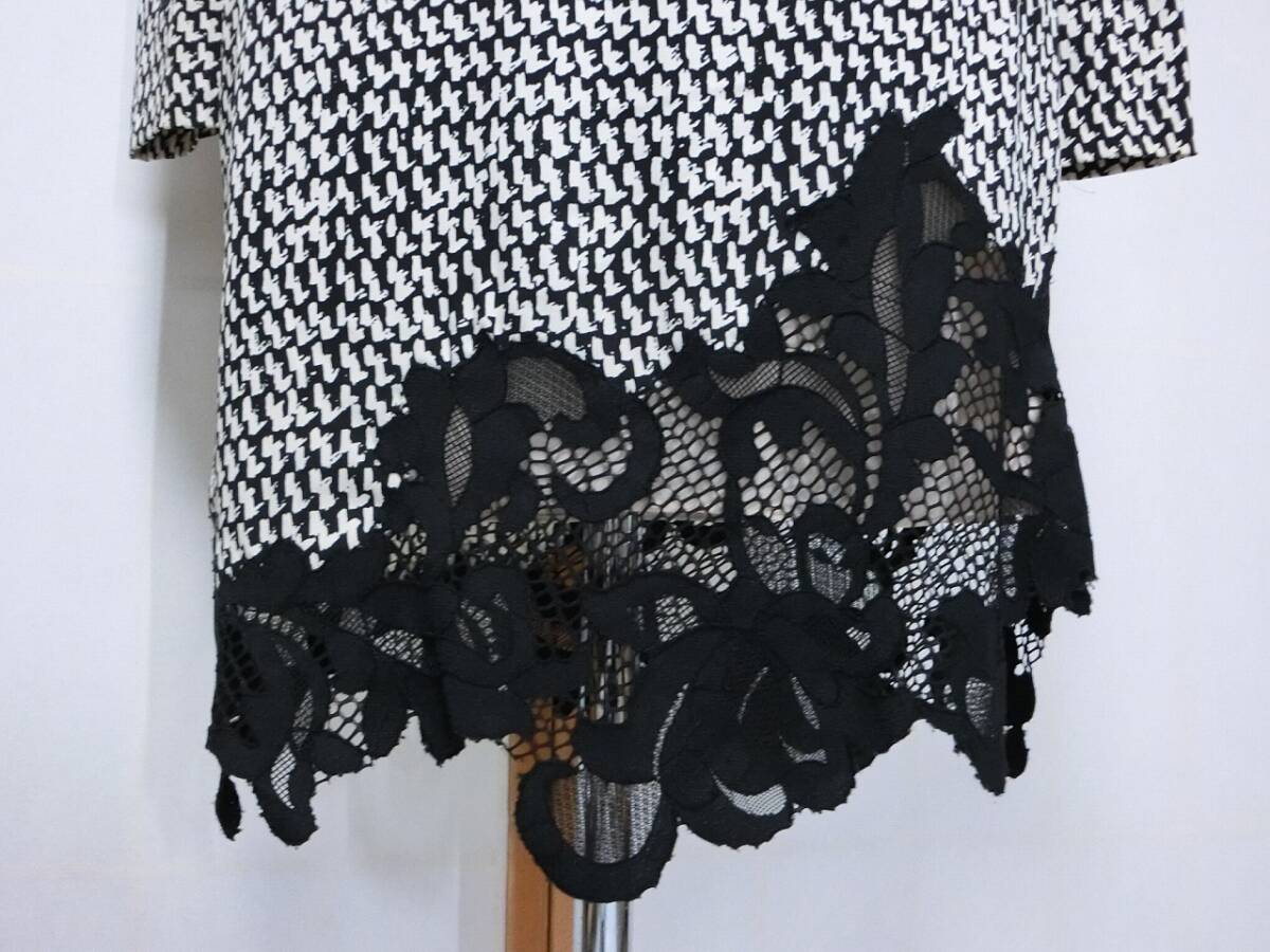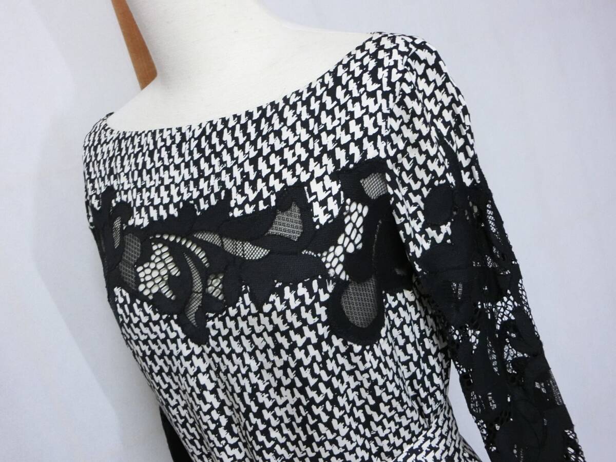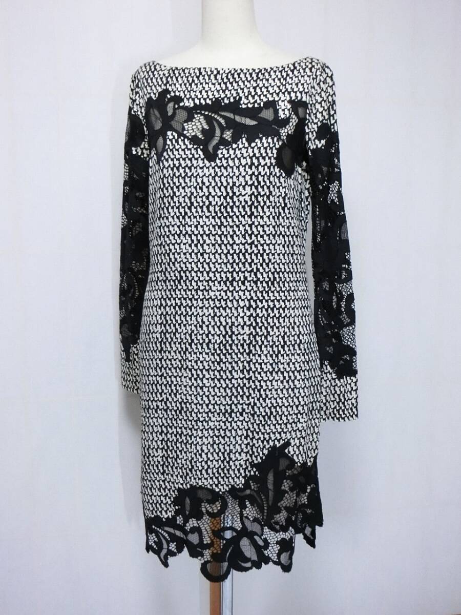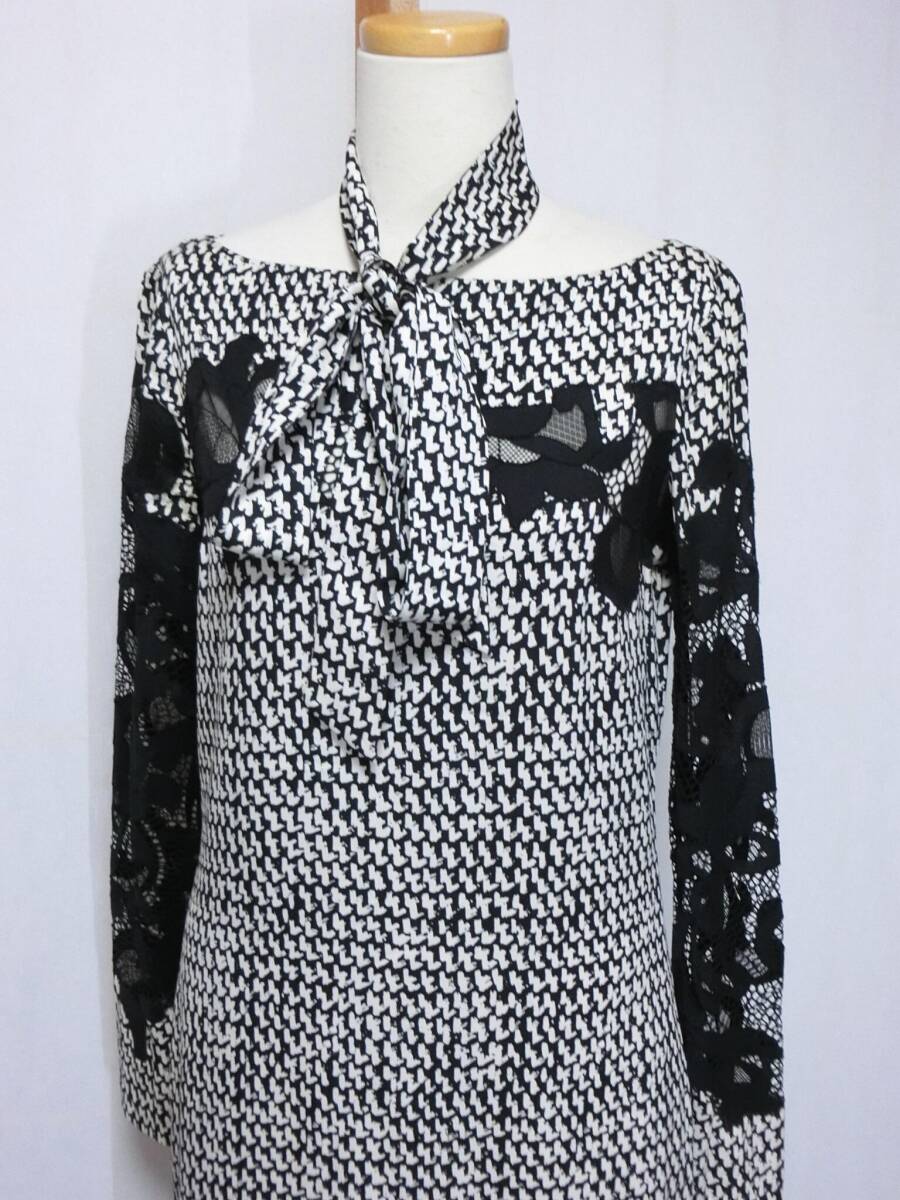 ★DIANE von FURSTENBERG ダイアン・フォン・ファステンバーグ 白と黒の柄に黒いレースが付いたシルクの長袖ワンピース 2★ベルト?付き