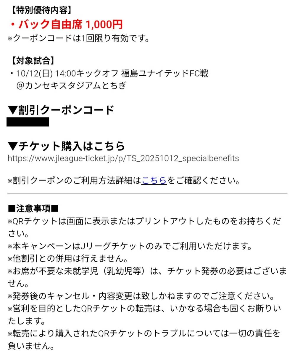 【優待】10/12 栃木SC vs 福島ユナイテッドFC バック自由席が1000円で買える割引クーポン チケット Jリーグ 10月12日③