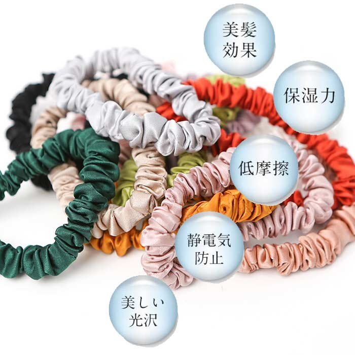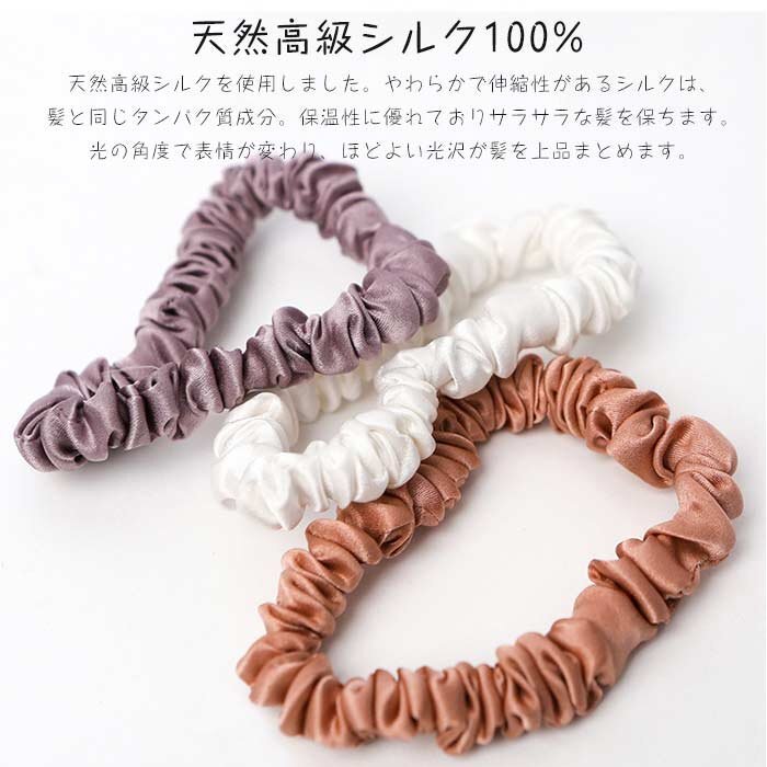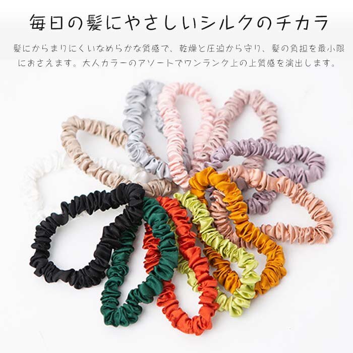 【毎日の髪にやさしいシルクのチカラ】天然高級シルク100%使用したヘアゴム サイズの シュシュです。髪にからまりにくいなめらかな質感で、乾燥と圧迫から守り、髪の負担を最小限におさえます。大人カラーのアソートでワンランク上の上質感を演出します。