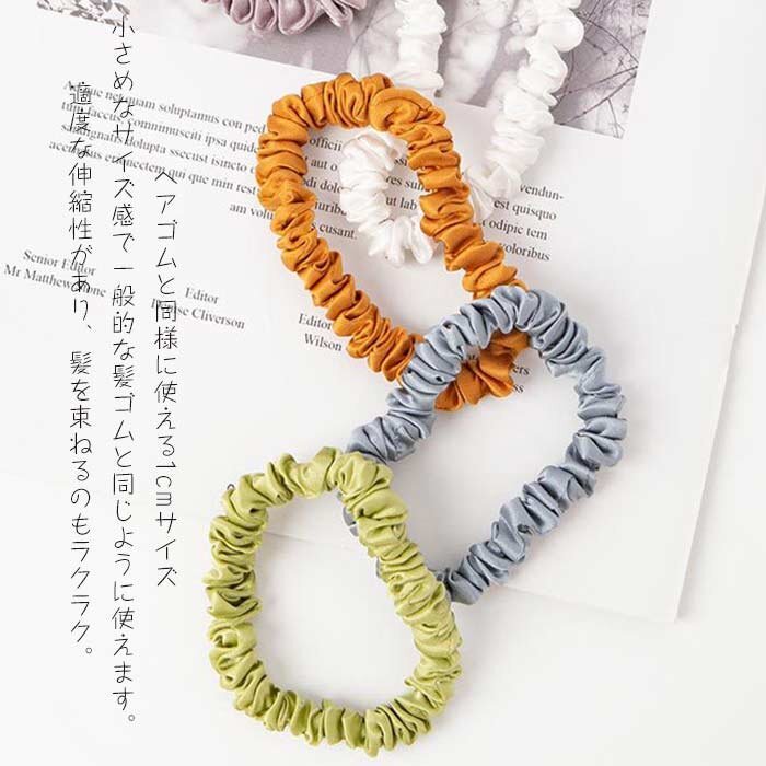 【使いやすいサイズ感】幅1cmの使いやすいコンパクトなサイズ。一般的なヘアゴム、髪ゴムと同じように日常的に使うことができます。小さめのサイズで使わない時は、手首にかけてアクセサリーとして使ってもおしゃれ。