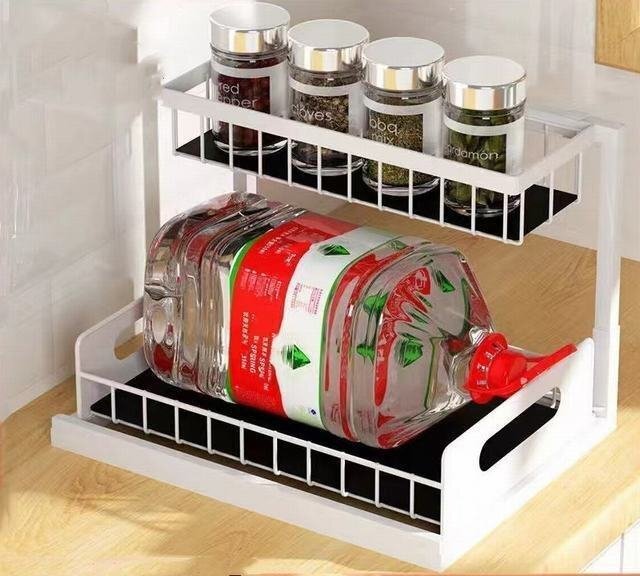 焼付け塗装で錆びにくくので、お手入れは簡単になります。雑巾で拭くことも丸洗いことも可能。ゴム製足で、滑りにくく家具にキズも付けません。2段引き出しデザインでシンク下に置きても引きのみで中の収納物を簡単に取り出します。2個引き出しがあるこそ、分類収納できます。