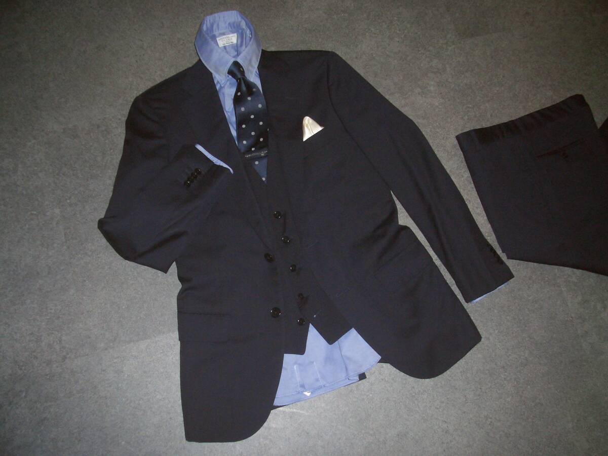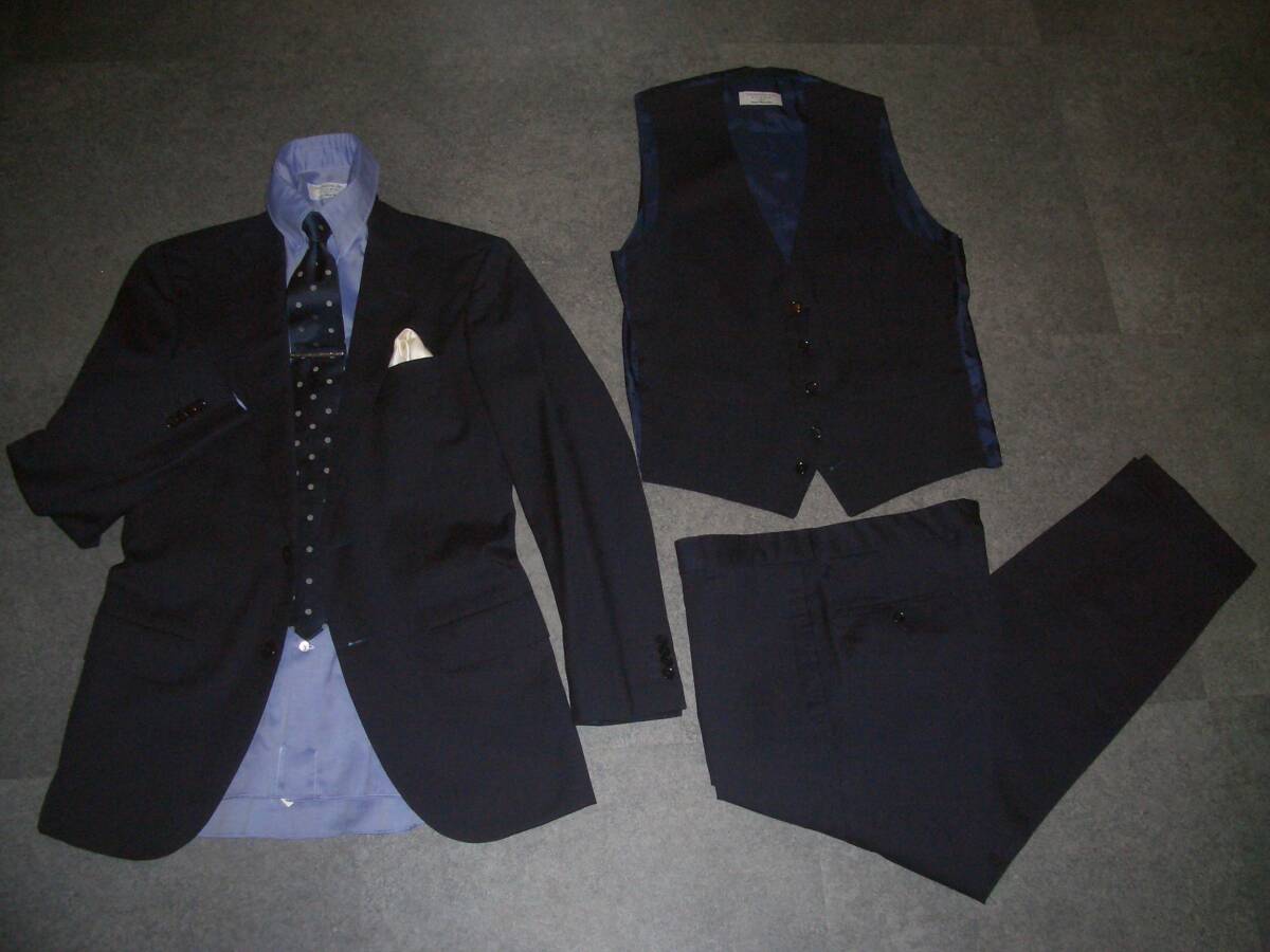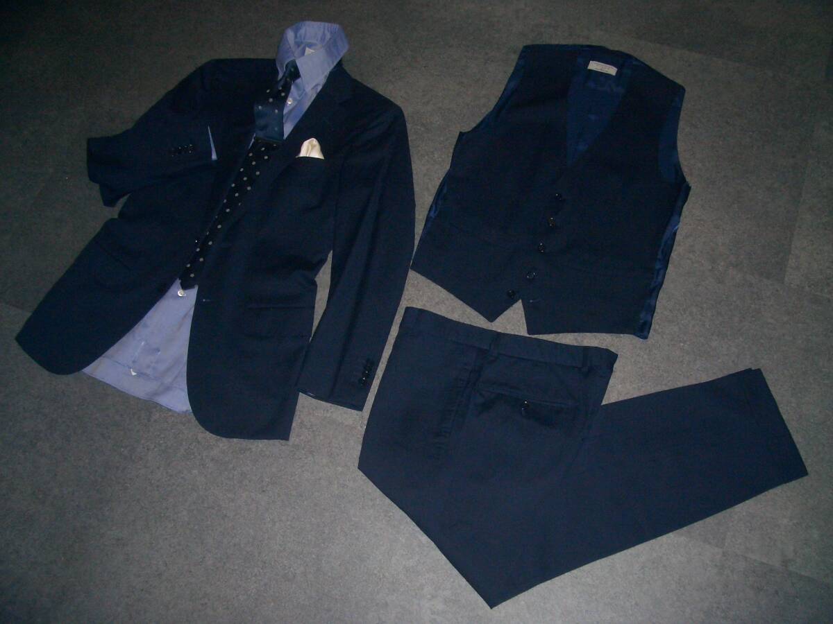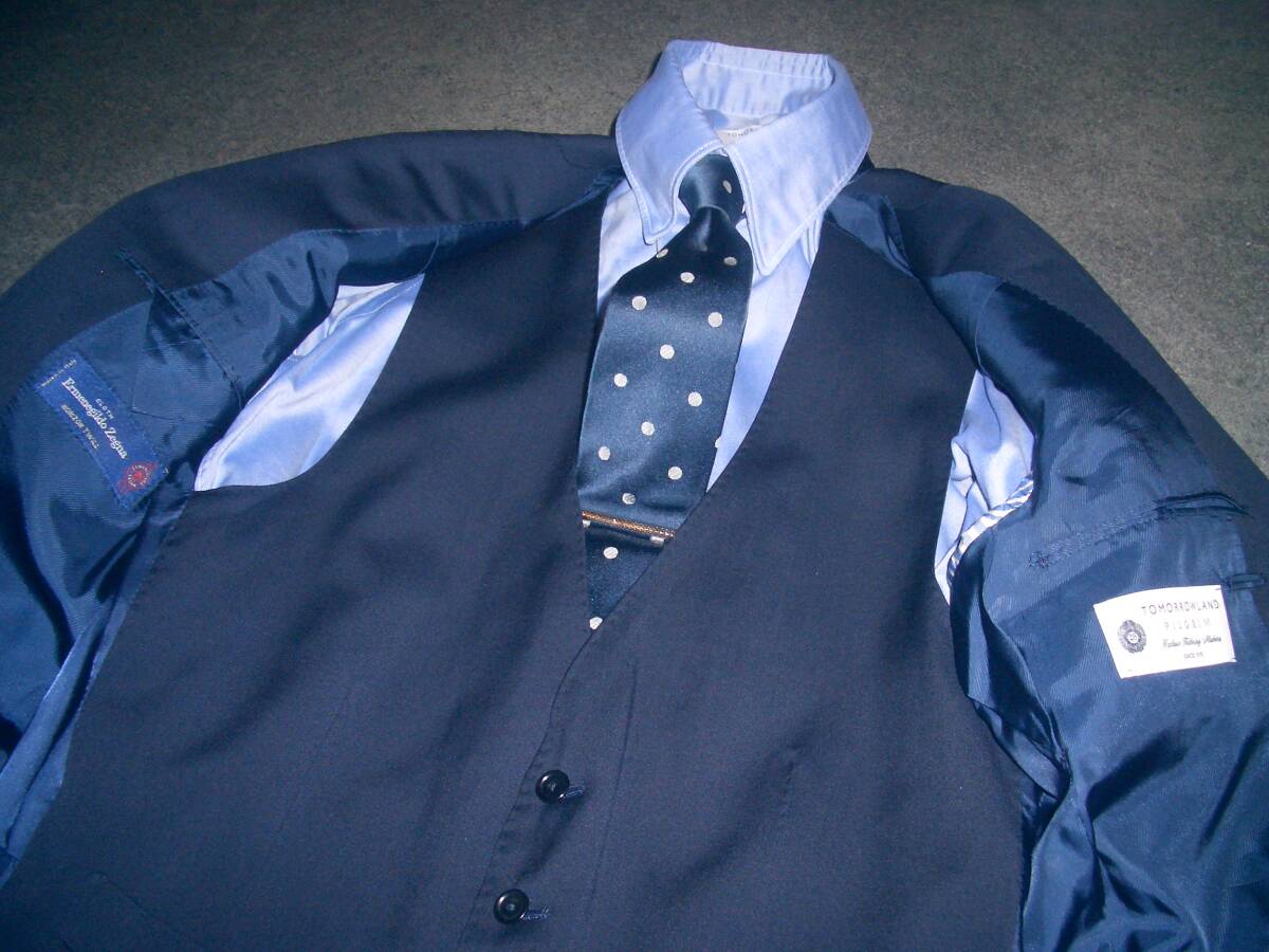 19万円 美品 トゥモローランド×ゼニア PILGRIM 3ピース スーツ 44 無地ネイビー TOMORROWLANDジャケットパンツベストスリーピースセット