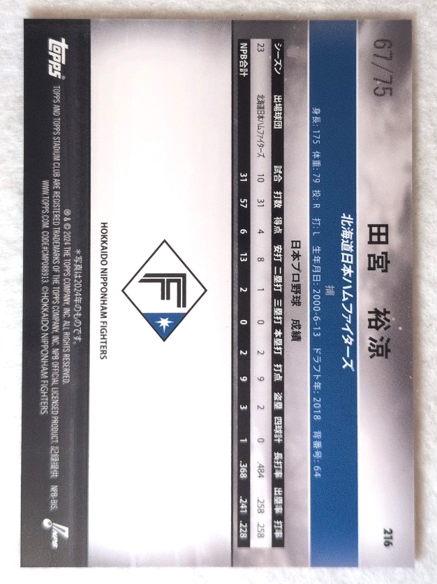 ★75枚限定★ 田宮 裕涼 北海道日本ハムファイターズ 67/75 TOPPS STADIUM CLUB 2024