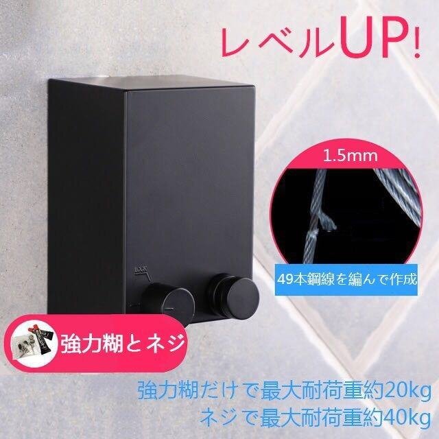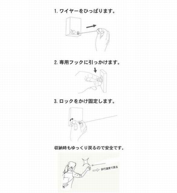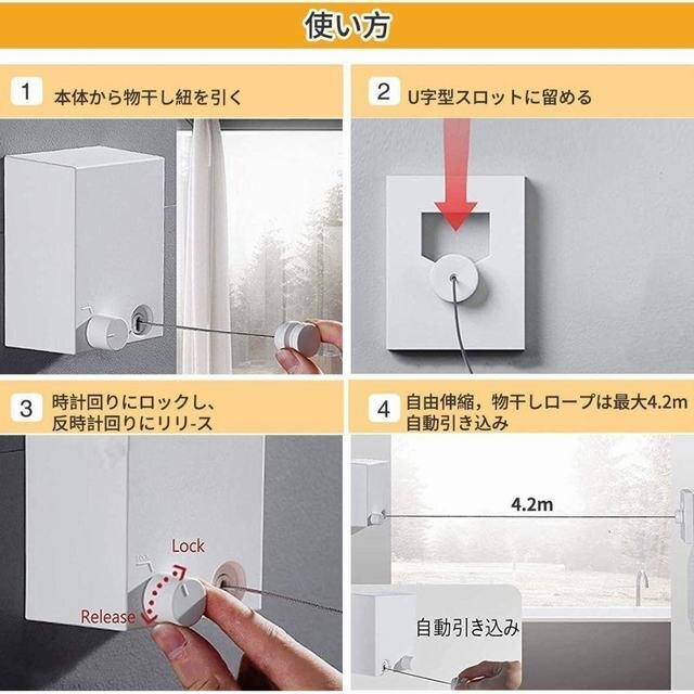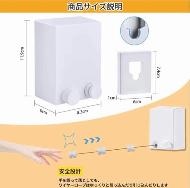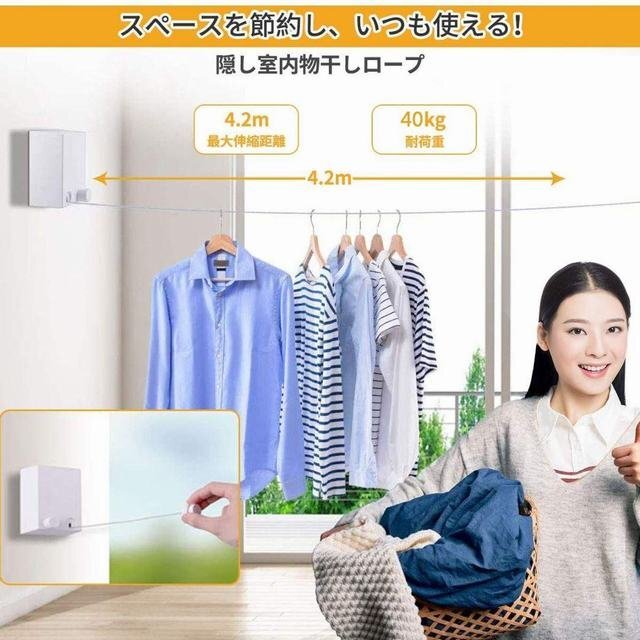 コメント必要無く直購入でよろしいです。 【2つ簡単な組み立て方法】壁に穴を開けても、開けなくても取り付けることができます。穴開け不要向き壁素材:金属?タイル?大理石?ガラス 穴開け推奨壁素材:ペンキの壁?壁紙?木製。 【耐荷重】強力糊では最大20kgまでの洗濯物を干すことができます。ネジでは最大40kgまでになります。 【室内物干ワイヤー良いヘルパー】たとえ花粉の季節に突然の雨、あるいは梅雨や台風など室外環境が悪い場合、こちらの室内物干しワイヤーで 楽に洗濯を干すことができます。 【伸縮性がある&圧力に負けず】この物干しロープは伸縮性を備えていて、自由に伸ばすことができ、最長が約4.2mです。 49本の細いステンレスワイヤーで編まれたロープは高強度、超柔軟性があります。 【省スペース?シーンを使用】 室内物干しワイヤーは壁付けタイプの為、省スペースで収納場所には困リません。使わない時は簡単に収納できます。 バスルーム、ベッドルーム、リビングルーム、インテリアバルコニー、クローク、その他の場所で使用できます。 【セキュリティの問題を解決する設計】 U字型バックルとロータリースイッチでロックするので、二重保護があり、脱落防止できます。誤って手放すと、歩行スピードでワイヤーが巻き取られる安全設計であります、けがをしません。あなたの完璧な衣服またはお体に傷害を引き起こすことはありません。