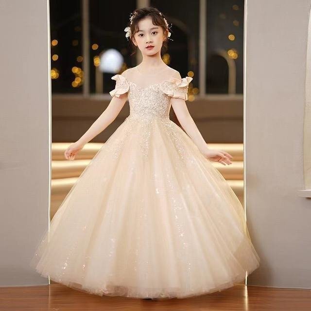 子供ドレス 女の子 記念写真 写真撮影服 ピアノ 発表会 演奏会 社交ダンスドレス おしゃれ 高級感シャンパン色 レース  150