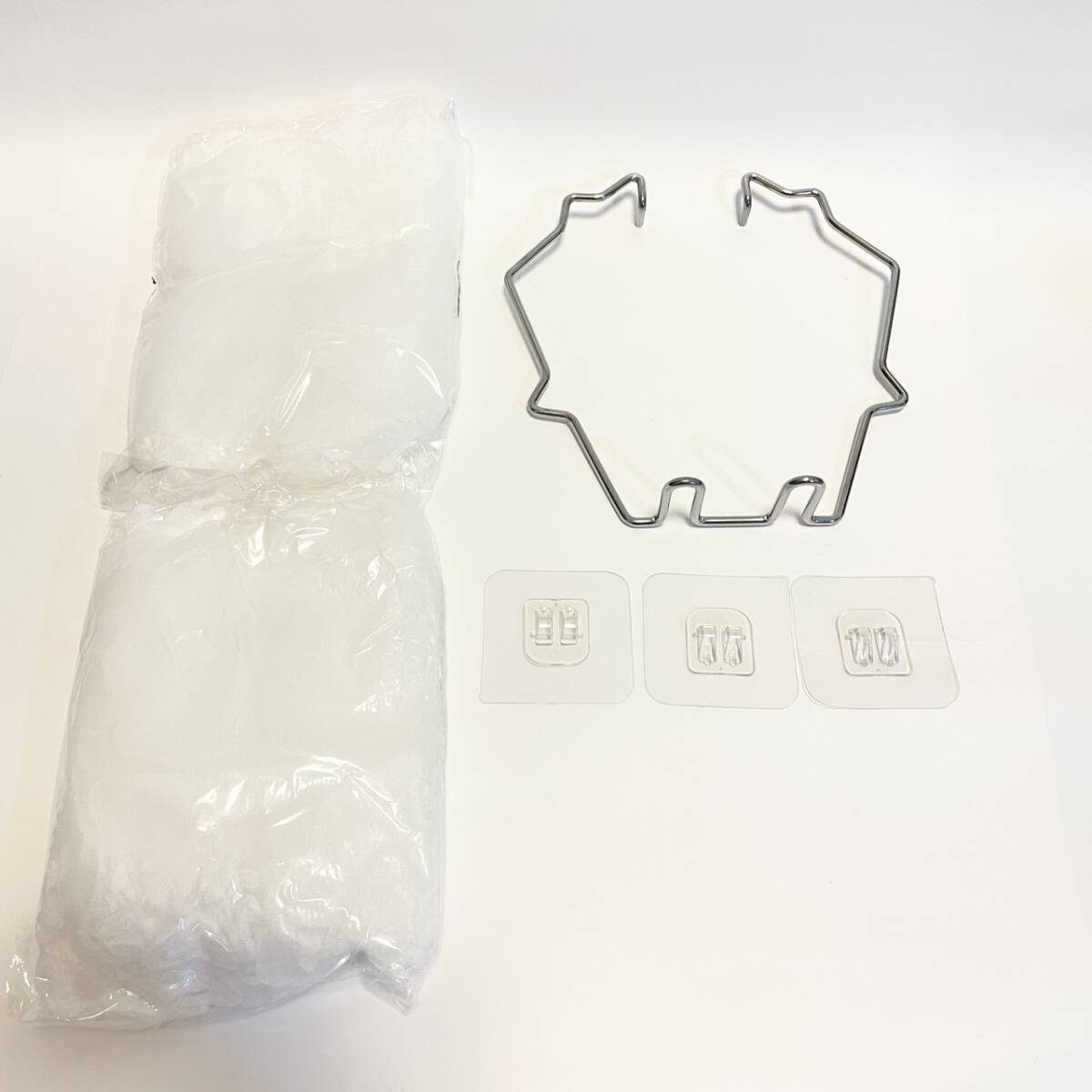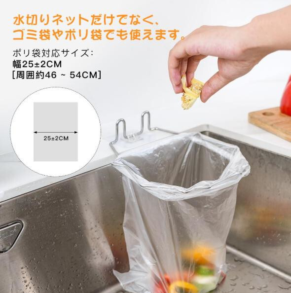 【商品仕様】パッケージ内容:水切り袋ホルダー*1個、水切りネット*100枚、固定シール*3個。本体サイズ:約、ゴミ袋/ポリ袋対応サイズ:幅25±2cm(周囲約46 ~ 54cm)