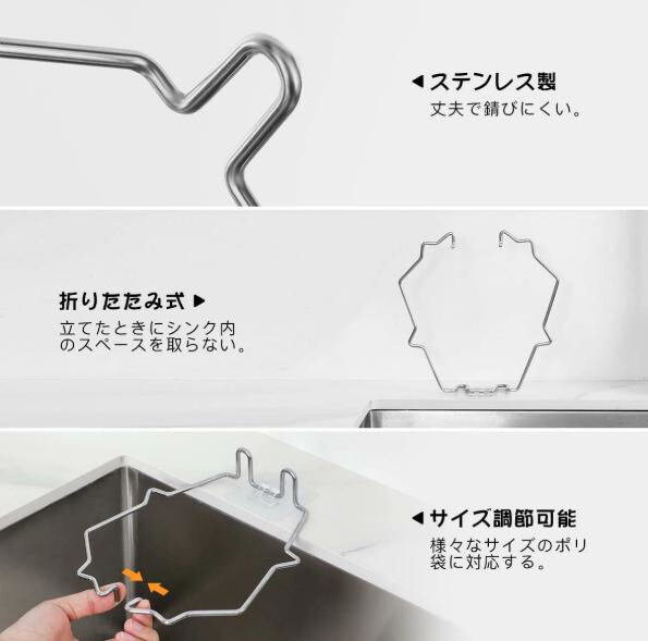 【高品質】ポリ袋ホルダーはステンレス製で丈夫で錆びにくく、簡単な構造なので洗いやすいです。水切りネットのメッシュは細かいので、小さなゴミもしっかりとキャッチします。使い捨てなので便利かつ衛生的です。
