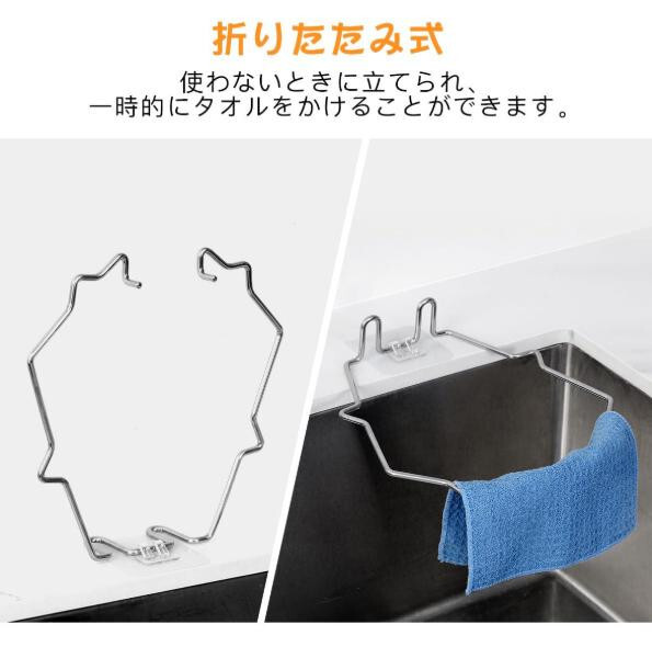 【省スペース】折りたたみ可能なデザインで、使わないときに立てられるため、シンク内のスペースを取らず、一時的にタオルをかけることができるなど、シンクのコーナースペースを最大限に活用しています。